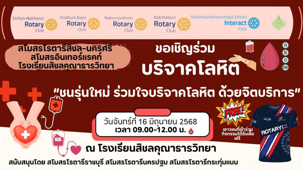 สโมสรโรตารีสิชล-นครศรี ขอเชิญร่วมบริจาคโลหิต "ชนรุ่นใหม่ ร่วมใจบริจาคโลหิต ด้วยจิตบริการ"