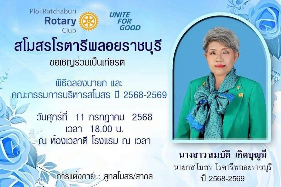 วันที่ 11 กรกฎาคม 2568 สโมสรโรตารีสนามจันทร์ นำโดย นย.สุกิจ นิยมทรัพย์ พร้อมด้วยอดีตนายกและสมาชิกสโมสรฯ เข้าร่วมแสดงความยินดีในพิธีสถาปนานายกและคณะกรรมการบริหารสโมสรโรตารีพลอยราชบุรี ปีบริหาร 2568-2569 เพื่อแสดงความยินดีเนื่องในโอกาสที่เข้ารับตำแหน่งนายกสโมสรโรตารีพลอยราชบุรี ณ ห้องเวลาดี โรงแรม ณ เวลา จ.ราชบุรี