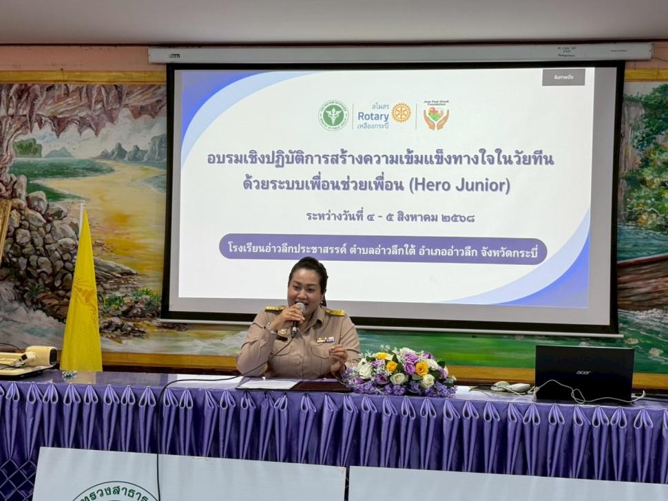 วันที่ 4 และ 5 สิงหาคม 2568 เวลา 8.30-16.00 น. สโมสรโรตารีเหลืองกระบี่ นำโดยนย.ดร. สุดารัตน์ แก้วเก้า พร้อมสมาชิก และ สโมสรโรตารีอ่าวลึก เข้าร่วมการอบรม เด็กนักเรียนมัธยมต้นและมัธยมปลาย พร้อมคณะคุณครูในเขตอำเภอ อ่าวลึก จังหวัดกระบี่วันละ 100 คน จัดอบรมโดยสาธารณสุขจังหวัดกระบี่และให้การอบรมโดย สถาบันจิตเวชเด็ก และวัยรุ่นเขต 11 จังหวัดสุราษฎร์ธานี ใน