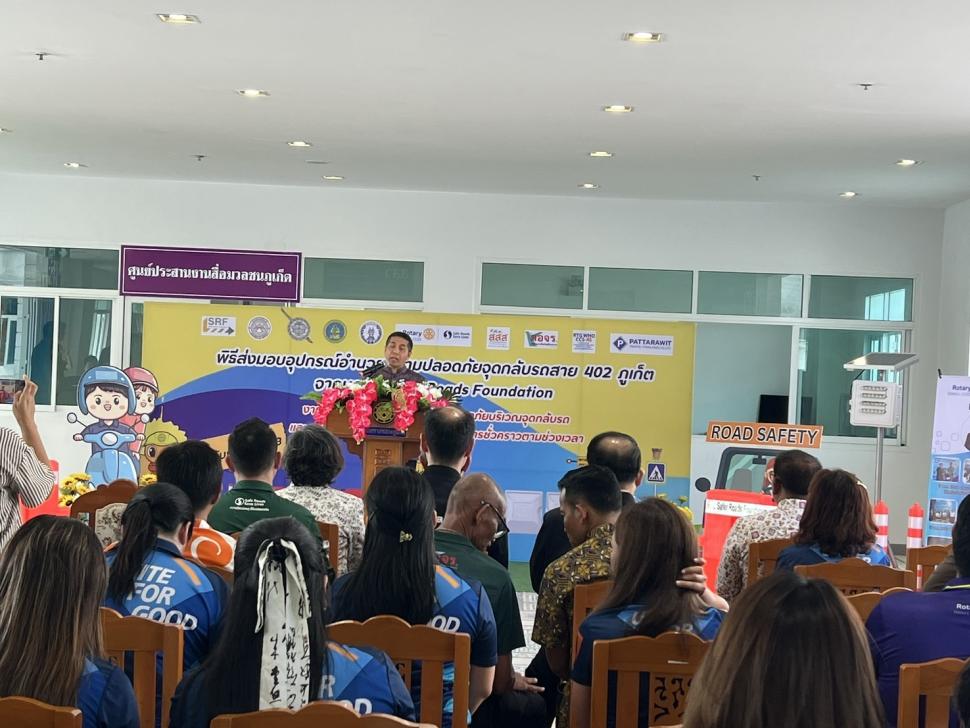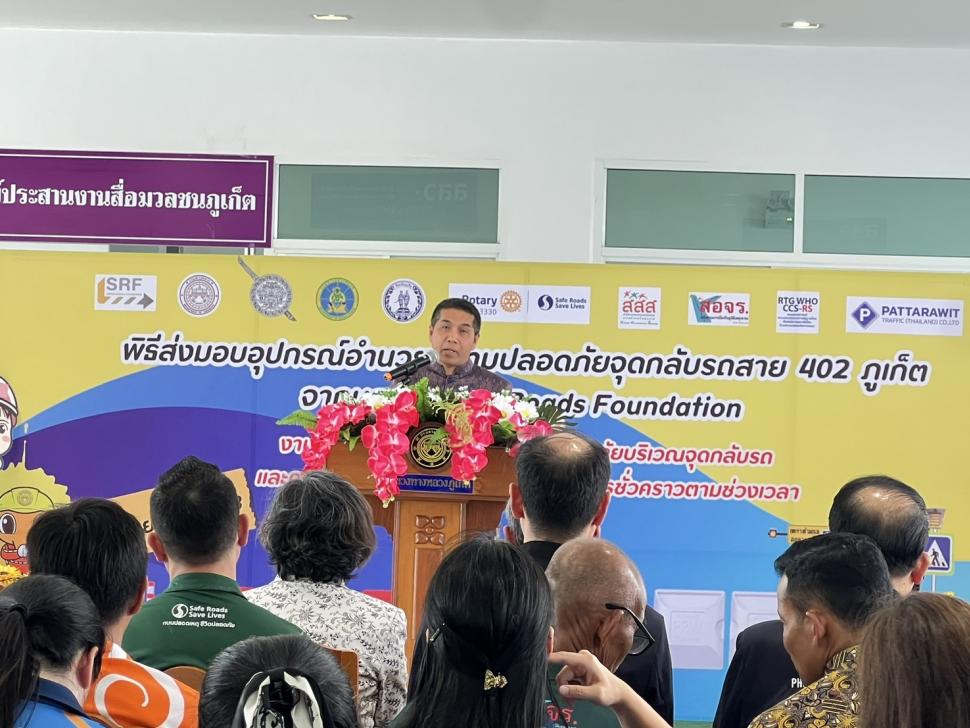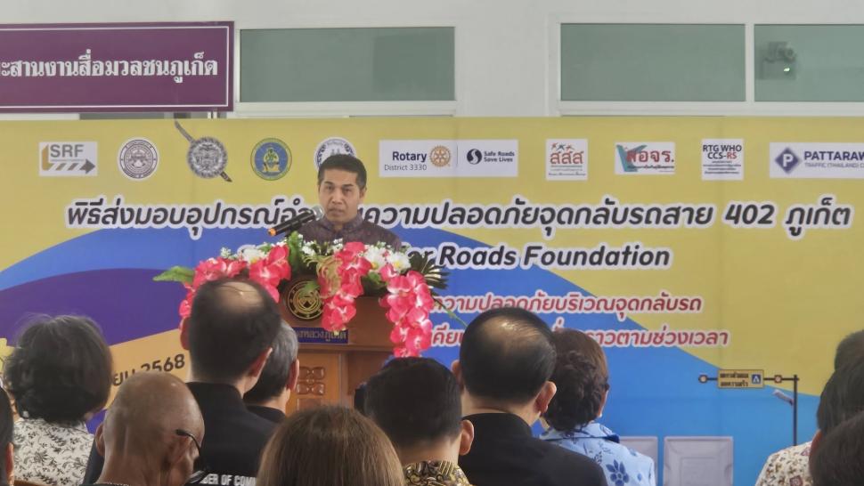 โดยมี นย.สถาปน์ เชื้อสถาปนศิริ และนายกเพิ่งผ่านพ้น ประภาพร แซ่อิ๋ว ในนามสโมสรโรตารีภูเก็ตเข้าร่วมกิจกรรมกับเหล่านายก อีก 10 สโมสรในจังหวัดภูเก็ต และมวลมิตรโรแทเรียน ร่วมส่งมอบอุปกรณ์ความปลอดภัยแก่ถนนสาย 402 (เทพกระษัตรี) ซึ่งจัดขึ้นเมื่อวันที่ 11 ก.ย.2568 เวลา 13.30-15.30 ณ ห้องอเนกประสงค์ ชั้น 1 ศาลากลางจังหวัดภูเก็ต โดยมีท่านผู้ว่าราชการจังหวัด นาย โสภณ สุวรรณรัตน์ และข้าราชการ หน่วยงานต่างๆ อาทิ กรมทางหลวง กองบังคับการตำรวจ หน่วยงานป้องกันภัย สาธารณสุขจังหวัดและสื่อมวชนต่างๆ ร่วมรับมอบ พร้อมฟังการบรรยายของท่านผู้ว่าฯ กล่าวถึงความสำคัญของมูลนิธิโรตารี ที่ได้จัดกิจกรรมซึ่อย่างดำเนินต่อเนื่องทุกปี เพื่อเป็นส่วนหนึ่งในการช่วยแก้ปัญหาจราจร ลดอุบัติเหตุรวมถึงการรับทราบแผนงานความคืบหน้า จากท่านผู้ว่าราชการฯ ถึงงานขยายเส้นทางที่ผ่านกฏหมาย และ ครม. การประสานแนวคิดลดอุบัติภัยระหว่างหน่วยงานราชการต่างๆ โดยการส่งมอบ ได้นำอุปกรณ์ติดตั้ง ยังบริเวณวงเวียนอนุสาวรีย์ท้าวเทพกระษัตรี ท้าวศรีสุนทร และจุดกลับรถต่างๆ แล้วเสร็จเป็นที่เรียบร้อย