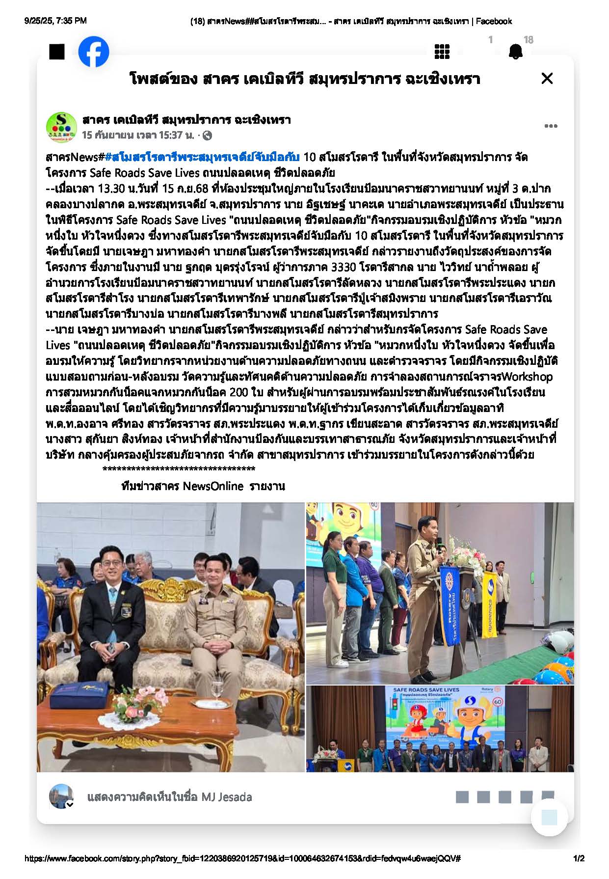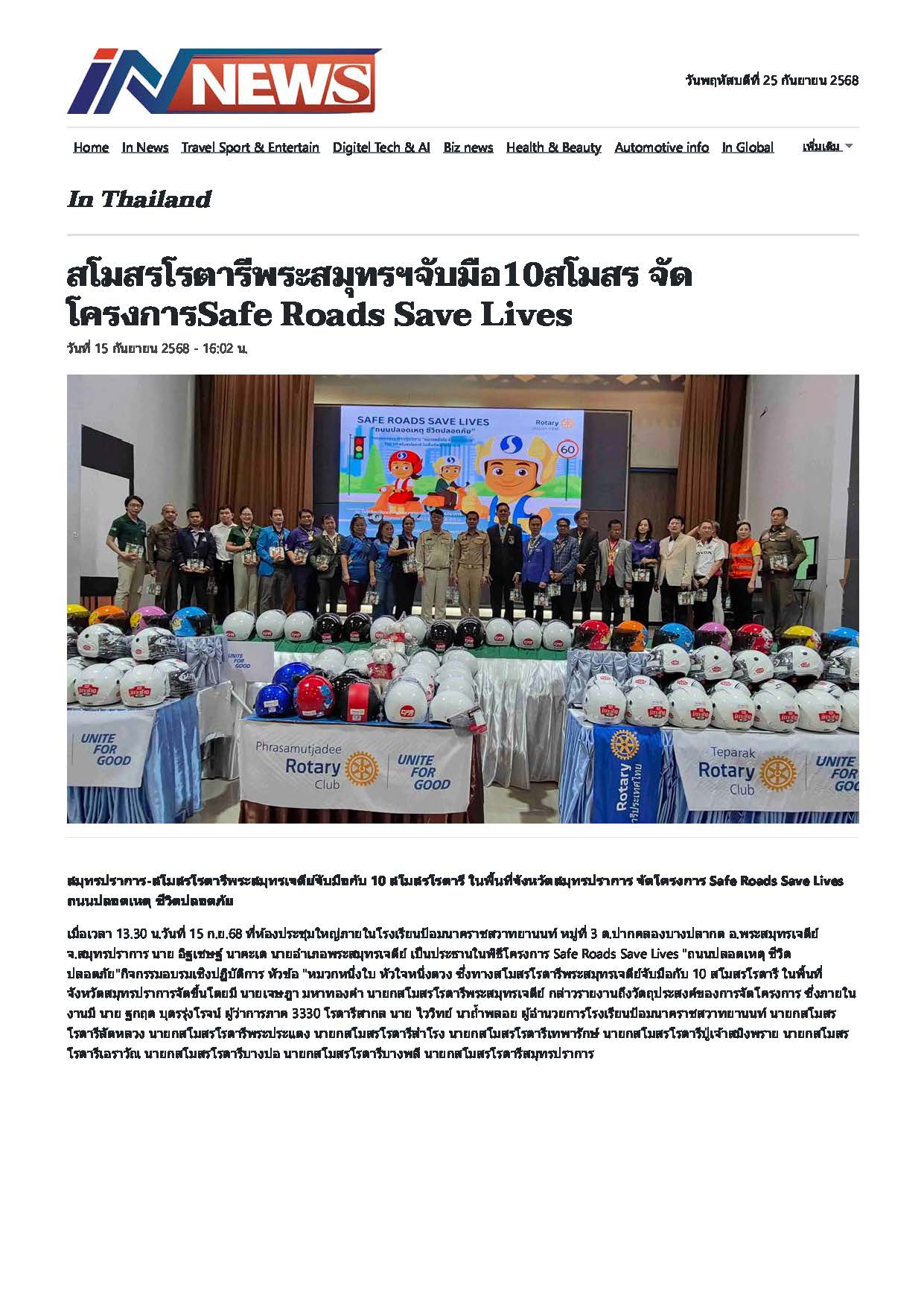 สโมสรโรตารีทั้ง 10 สโมสรในพื้นที่สมุทรปราการ นำโดย นายเจษฎา มหาทองคำ นายกสโมสรโรตารีพระสมุทรเจดีย์ ร่วมกับภาครัฐ ภาคเอกชน และเครือข่ายภาคี จัดอบรมเชิงปฏิบัติการ โครงการ “ถนนปลอดเหตุ ชีวิตปลอดภัย” พร้อมมอบหมวกนิรภัยกว่า 200 ใบ แก่เยาวชนและประชาชน เพื่อส่งเสริมความปลอดภัยและลดความรุนแรงจากอุบัติเหตุบนท้องถนน ณ โรงเรียนป้อมนาคราชสวาทยานนท์ อ.พระสมุทรเจดีย์
