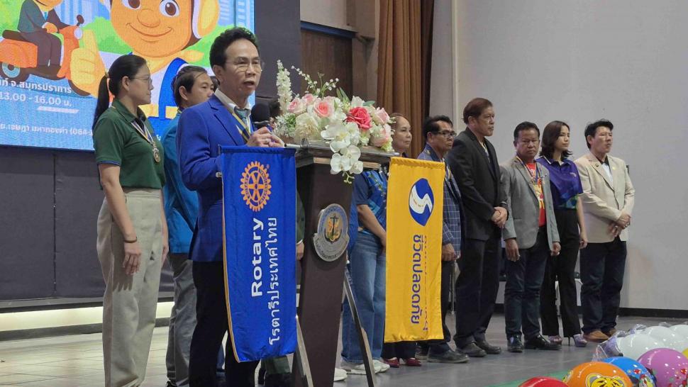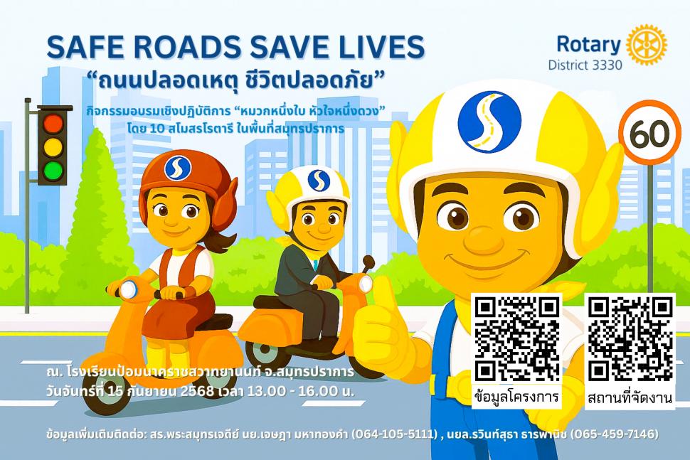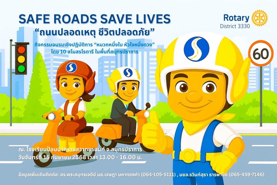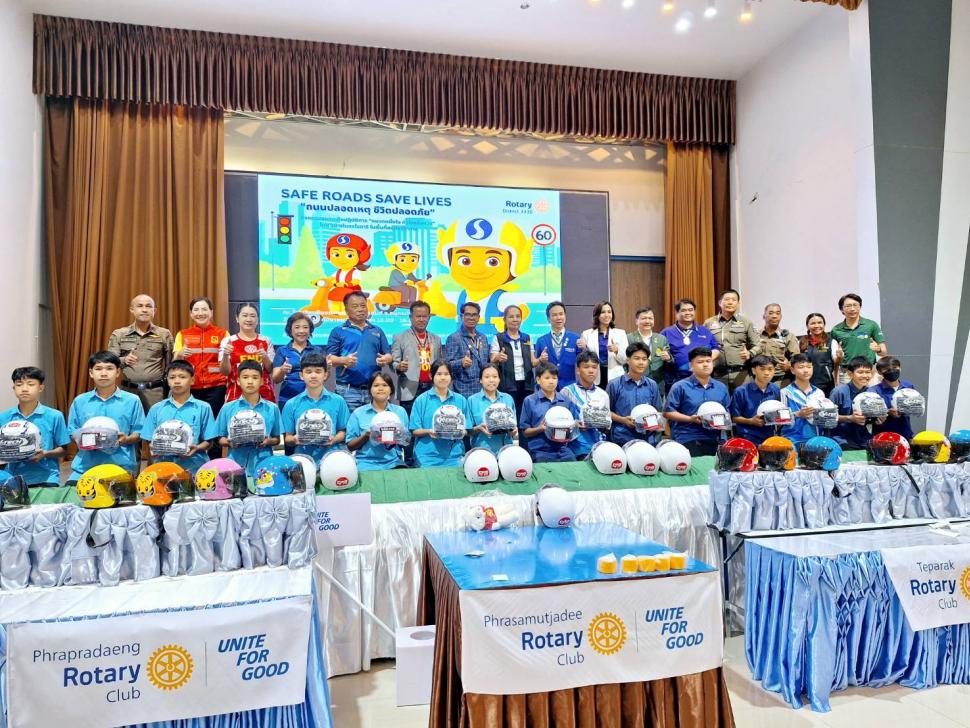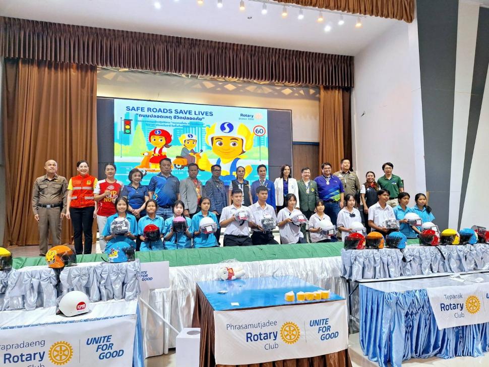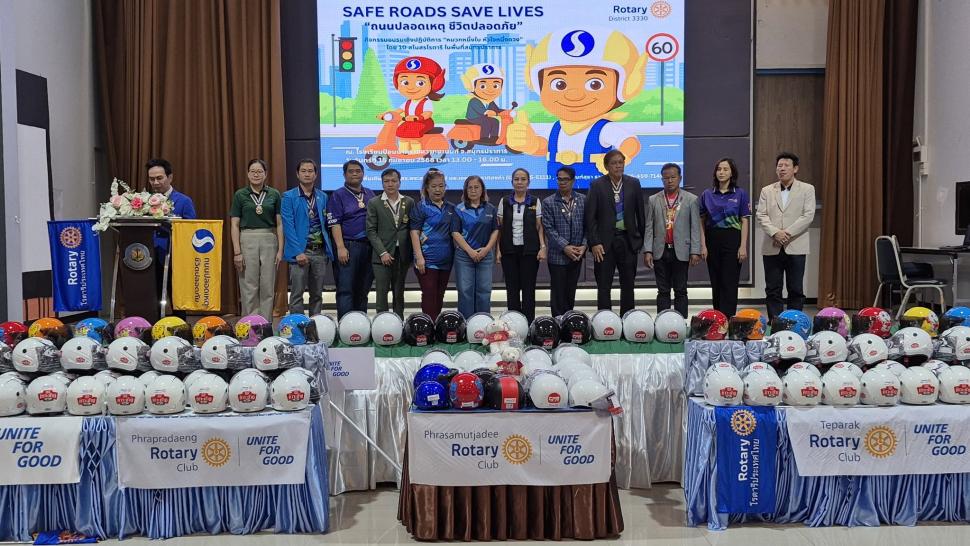 วันที่ 15 กันยายน 2568 เวลา 13.30-16.00 น. นย.พีรเดช ประชุมชนเจริญ นายกสโมสรโรตารีเทพารักษ์ ภาค 3330 พื้นที่ 22 ปีโรตารี 2568-2569 และสมาชิกสโมสรฯ ร่วมเปิดโครงการอบรมเชิงปฏิบัติการ “หมวกหนึ่งใบ หัวใจหนึ่งดวง” ภายใต้โครงการ Safe Roads Save Lives “ถนนปลอดเหตุ ชีวิตปลอดภัย” ณ ห้องประชุมใหญ่ โรงเรียนป้อมนาคราชสวาทยานนท์ อำเภอพระสมุทรเจดีย์ จังหวัดสมุทรปราการ โดยสโมสรโรตารีพระสมุทรเจดีย์ เป็นเจ้าภาพหลักจับมือกับสโมสรโรตารีในจังหวัดสมุทรปราการอีก 9 สโมสร