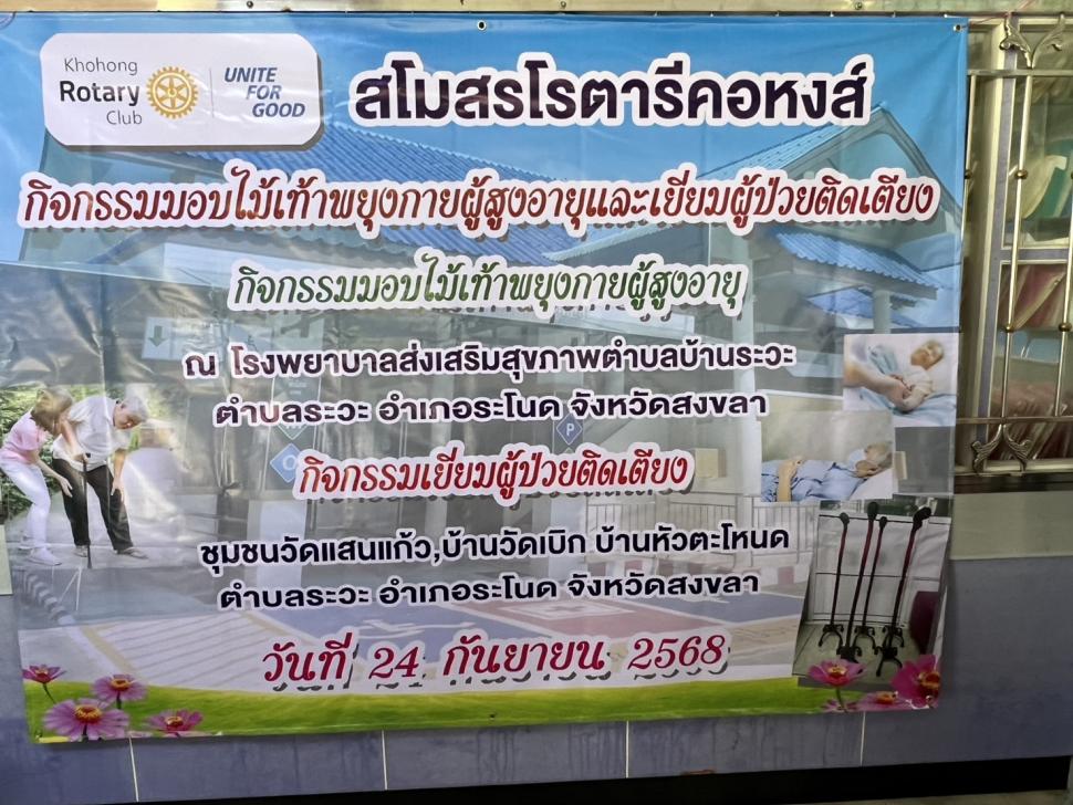 วันที่ 24 กันยายน 2568 สโมสรโรตารีคอหงส์ นำโดย นย.บุุญเรือง ถาวรวิสิทธิ์ พร้อมด้วยสมาชิกส่วนหนึ่ง ได้เดินทางไปทำกิจกรรมมอบไม้เท้าพยุงกายแก่ผู้สูงอายุ ในพื้นที่ หมู่ 1 ตำบลระวะ จำนวน 20 ท่าน ณ โรงพยาบาลส่งเสริมสุขภาพตำบลระวะ อ.ระโนด จ.สงขลา หลังจากนั้นก็ได้ไปเยี่ยมผู้ป่วยติดเตียงที่อาศัยอยู่ในชุมชนวัดแสนแก้ว ชุมชนวัดเบิก และชุมชนบ้านหัวตะโหนด จำนวน 9 ท่าน โดยได้มอบแพมเพิส นมกล่อง และน้ำดื่ม ให้แก่ผู้ป่วยทุกท่าน ในการไปทำกิจกรรมบำเพ็ญประโยชน์ครั้งนี้ ได้รับความร่วมมืออย่างดีเยี่ยมจากผู้อำนวยการโรงพยาบาลส่งเสริมสุขภาพตำบลระวะ ผู้ใหญ่บ้านและผู้ช่วยผู้ใหญ่บ้าน หมู่ 1 ตำบลระวะ รวมทั้งสมาชิกกิติมศักดิ์ของสโมสร คุณชำนาญ มานิล ที่ได้ความอนุเคราะห์ติดต่อประสานงานได้อย่างดีเยี่ยม ผู้สูงอายุและผู้ป่วยติดเตียงรวมทั้งครอบครัว มีความพึงพอใจเป็นอย่างมากกับการทำกิจกรรมในครั้งนี้