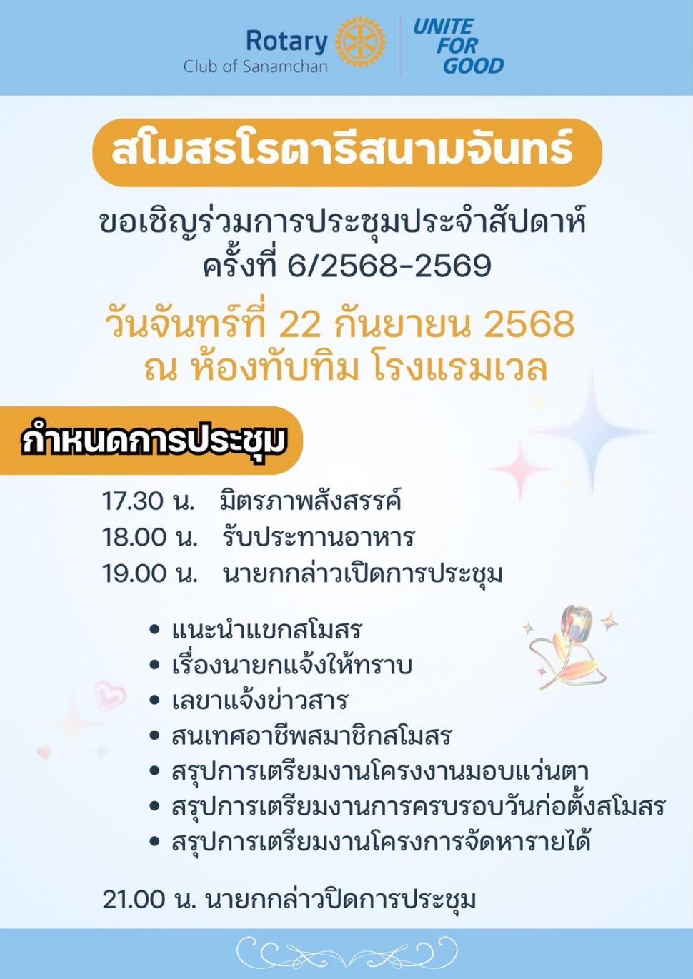 วันที่ 22 กันยายน 2568 สโมสรโรตารีสนามจันทร์ ประชุมปกติประจำสัปดาห์ ครั้งที่ 6/2568-2569 นำโดย นย.สุกิจ นิยมทรัพย์ พร้อมด้วยคณะกรรมการ สมาชิกและแอนน์ ต้อนรับแขกสโมสรจาก Rotary club of Gyaneswor 2 ท่าน Bharat Kumar Shrestha และ Rasumila Shrestha, สนเทศอาชีพโรตารี โดย อน.เทวินทร์ บุปผาคำ, สรุปการเตรียมงานโครงการมอบแว่นสายตาให้กับผู้ด้อยโอกาส “Vision for All สายตาเพื่อทุกคน” และ สรุปการเตรียมงานครบรอบวันก่อตั้งสโมสร โดย อน.ชาญสิริ เจาฑานนท์