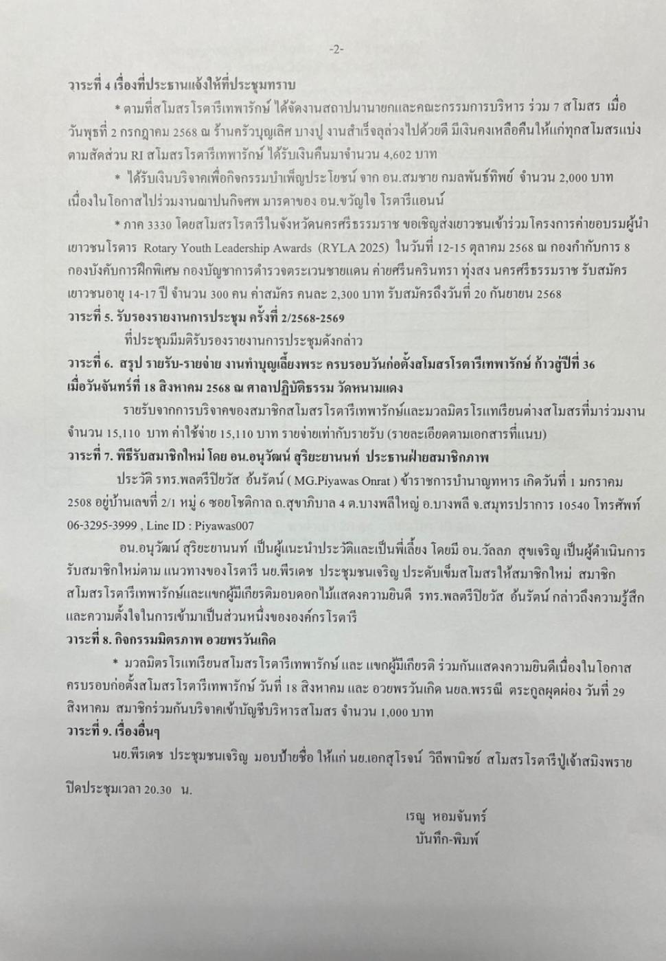วันพฤหัสบดีที่ 25 กันยายน 2568 เวลา 18.00 - 20.00 น. ณ ห้องประชุมครัวบ้านสวน ถนนเทพารักษ์ อ.เมือง จ.สมุทรปราการ นย. พีรเดช ประชุมชนเจริญ นายกสโมสรโรตารีเทพารักษ์ ภาค 3330 พื้นที่ 22 ปีโรตารี 2568-2569 พร้อมด้วยสมาชิกสโมสร โรตารีแอนน์ สุภาพบุรุษ และแขกต่างสโมสร เข้าร่วมประชุมอย่างอบอุ่น