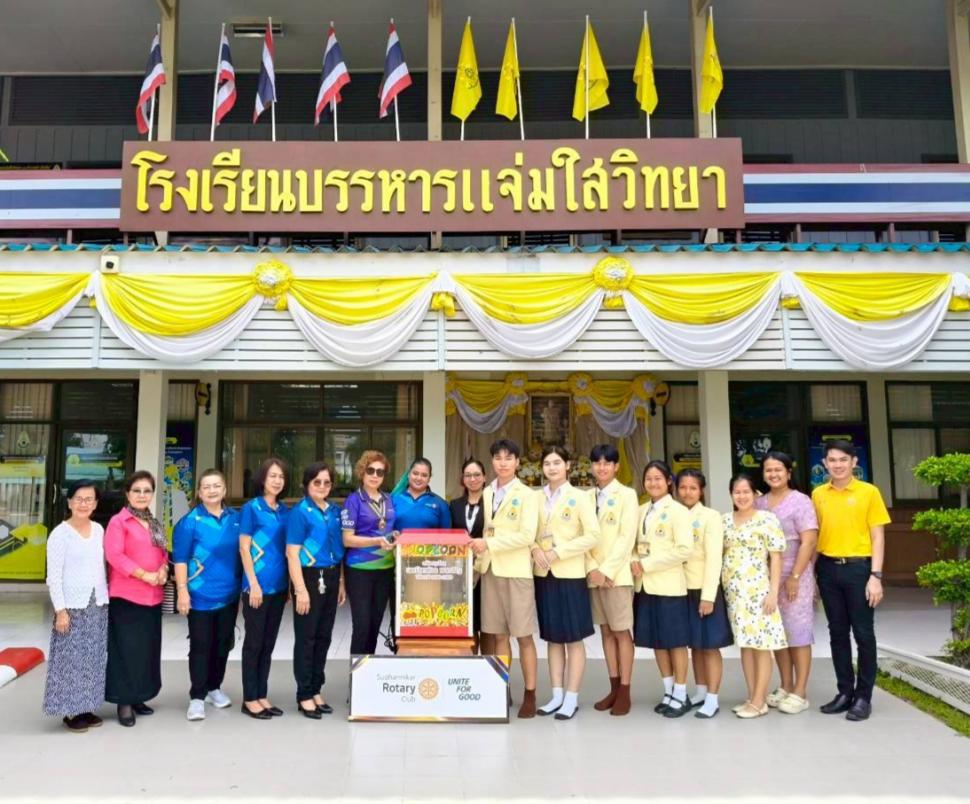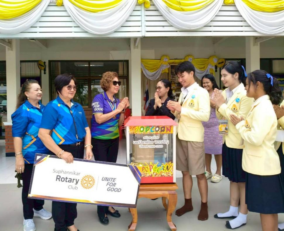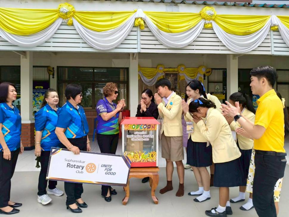 จันทร์ 29 ก.ย.68 : งานส่งเสริมอาชีพ สโมสรโรตารีสุพรรณิการ์ นำโดย นย.ปียาพัชร พาเจริญ พร้อมสมาชิก มอบตู้ข้าวโพดอบเนย (ป๊อปคอร์น) ให้กับ สโมสรอินเทอร์แรคท์โรงเรียนบรรหารแจ่มใสวิทยา 1 ในอุปถัมภ์ฯ เพื่อนำไปประกอบอาชีพและจัดหารายได้บำเพ็ญประโยชน์ต่อไป ณ โรงเรียนบรรหารแจ่มใสวิทยา 1 อำเภอดอนเจดีย์ จังหวัดสุพรรณบุรี