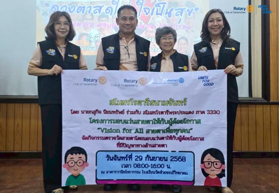 สโมสรโรตารีสนามจันทร์ นำโดย นายกสุกิจ นิยมทรัพย์ อดีตนายก และสมาชิก ร่วมกับสโมสรโรตารีพระประแดง โดย อน.สมถวิล เทศวัง ได้จัดทำโครงการมอบแว่นตาให้กับผู้ด้อยโอกาส “Vision for All สายตาเพื่อทุกคน” โดยได้รับการตรวจวัดสายตาจากทีมแพทย์ของบริษัทโฮย่า ในวันที่ 29 กันยายน 2568 เวลา 08.00-16.00 น. ณ ห้องโสตฯ2 โรงเรียนวัดห้วยจรเข้วิทยาคม จ.นครปฐม