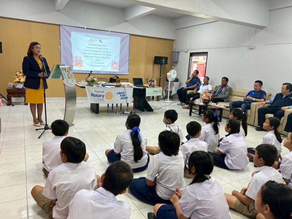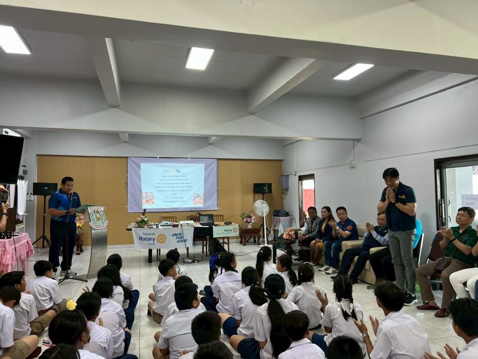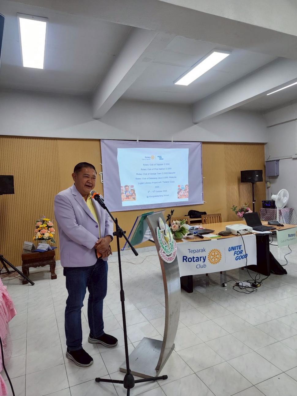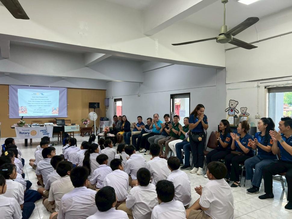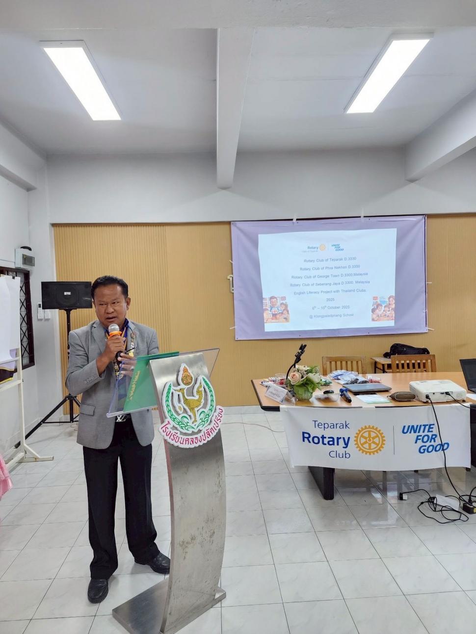 นย. พีรเดช ประชุมชนเจริญ นายกสโมสรโรตารีเทพารักษ์ ภาค 3330 ปีโรตารี 2568-2569 พร้อมด้วยสมาชิกสโมสร โรตารีแอนน์ สุภาพบุรุษ และแขกต่างสโมสร ร่วมเปิดโครงการ English Literacy Project (การเรียนรู้ภาษาอังกฤษ) วันที่ 6-10 ตุลาคม 2568 ณ โรงเรียนคลองปลัดเปรียง ตำบลบางแก้ว อำเภอบางพลี จังหวัดสมุทรปราการ เข้าร่วมพิธีฯ อย่างอบอุ่น