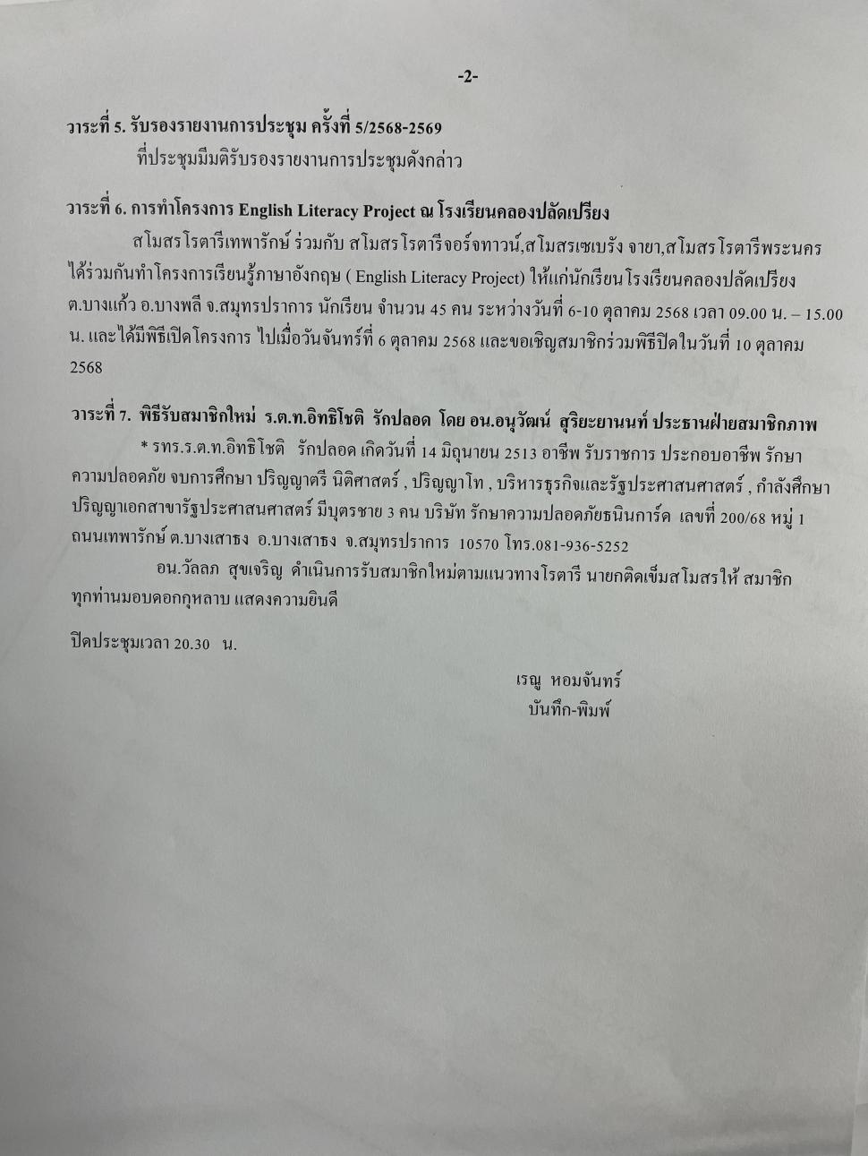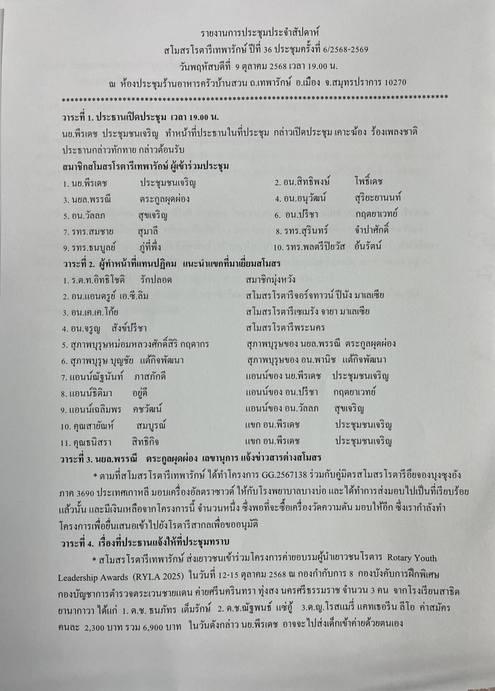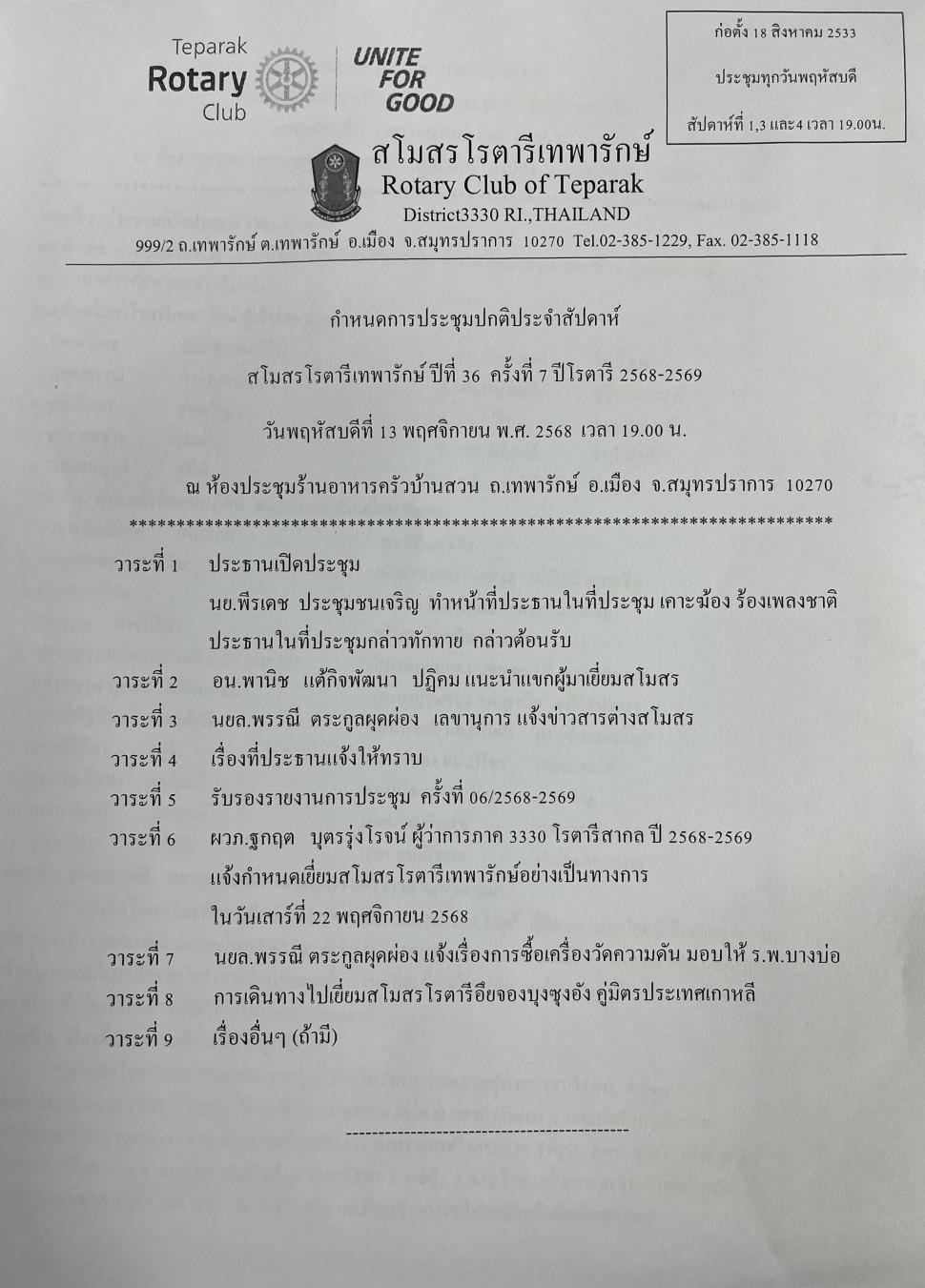 ➖ วาระที่ 6 ผวภ.ฐกฤต บุตรรุ่งโรจน์ผู้ว่าการภาค 3330 โรตารีสากล ปี 2568-2569 แจ้งกำหนดเยี่ยมสโมสรโรตารีเทพารักษ์อย่างเป็นทางการ