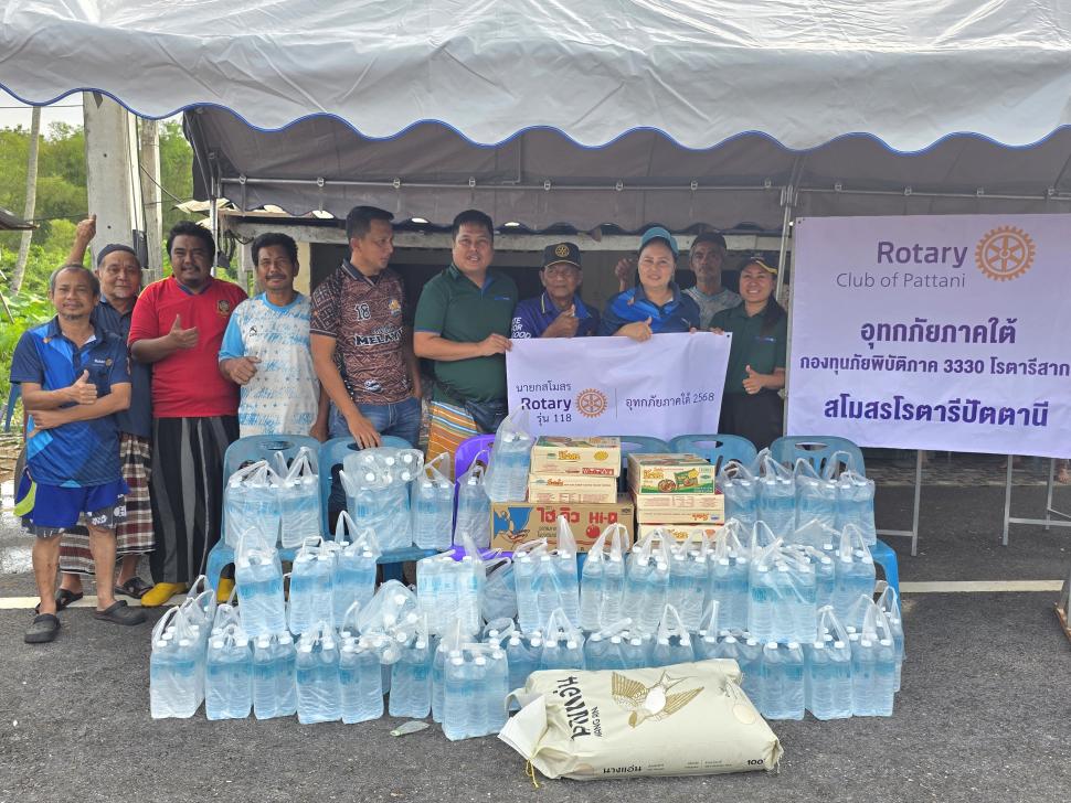 เมื่อวันที่ 27 พฤศจิกายน 2568 เวลา 14:00น. ณ เต็นท์ประกอบอาหารชั่วคราวบ้านม่วงหวาน อ.มายอ จ.ปัตตานี นายกมล ผ่องใส นายกสโมสรโรตารีปัตตานี และสมาชิกสโมสรโรตารีปัตตานี ร่วมทำกิจกรรมบำเพ็ญประโยชน์แจกจ่ายน้ำดื่มสะอาด และอาหารแห้ง เพื่อบรรเทาความเดือดร้อนแก่ผู้ประสบภัยน้ำท่วม
