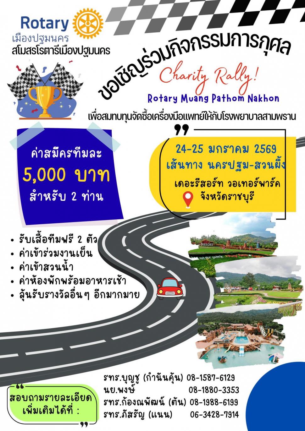 ... สโมสรโรตารีเมืองปฐมนคร ขอเชิญร่วมกิจกรรมการกุศล " สโมสรโรตารีเมืองปฐมนครแรลลี่การกุศล Charity Rally Rotary Maung Pathom Nakhon " 24-25 มกราคม 2569 เส้นทาง นครปฐม-สวนผึ้ง (เดอะรีสอร์ท วอเตอร์พาร์ค @ สวนผึ้ง) รายได้หลังหักค่าใช้จ่าย เพื่อสมทบทุนซื้อเครื่องมือแพทย์ให้แก่ โรงพยาบาลสามพราน (ไร่ขิง)
