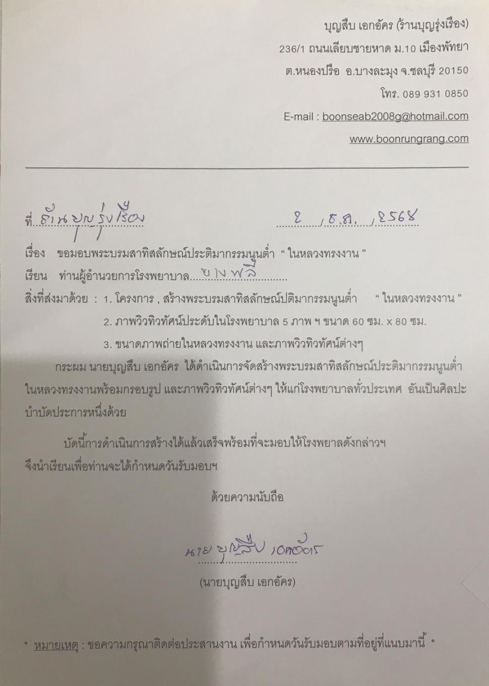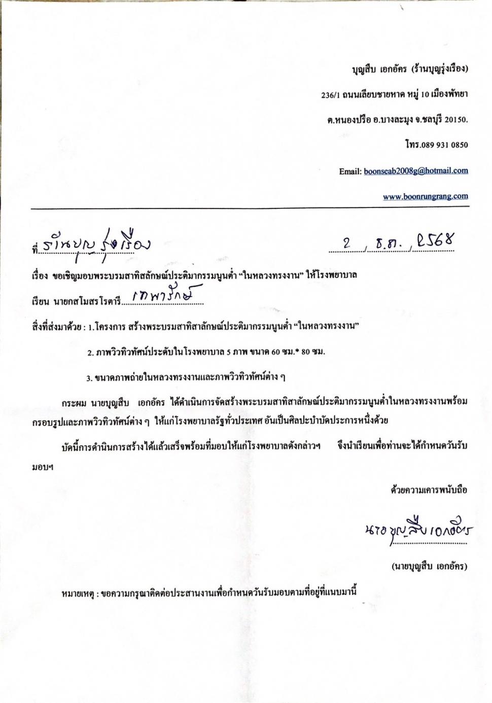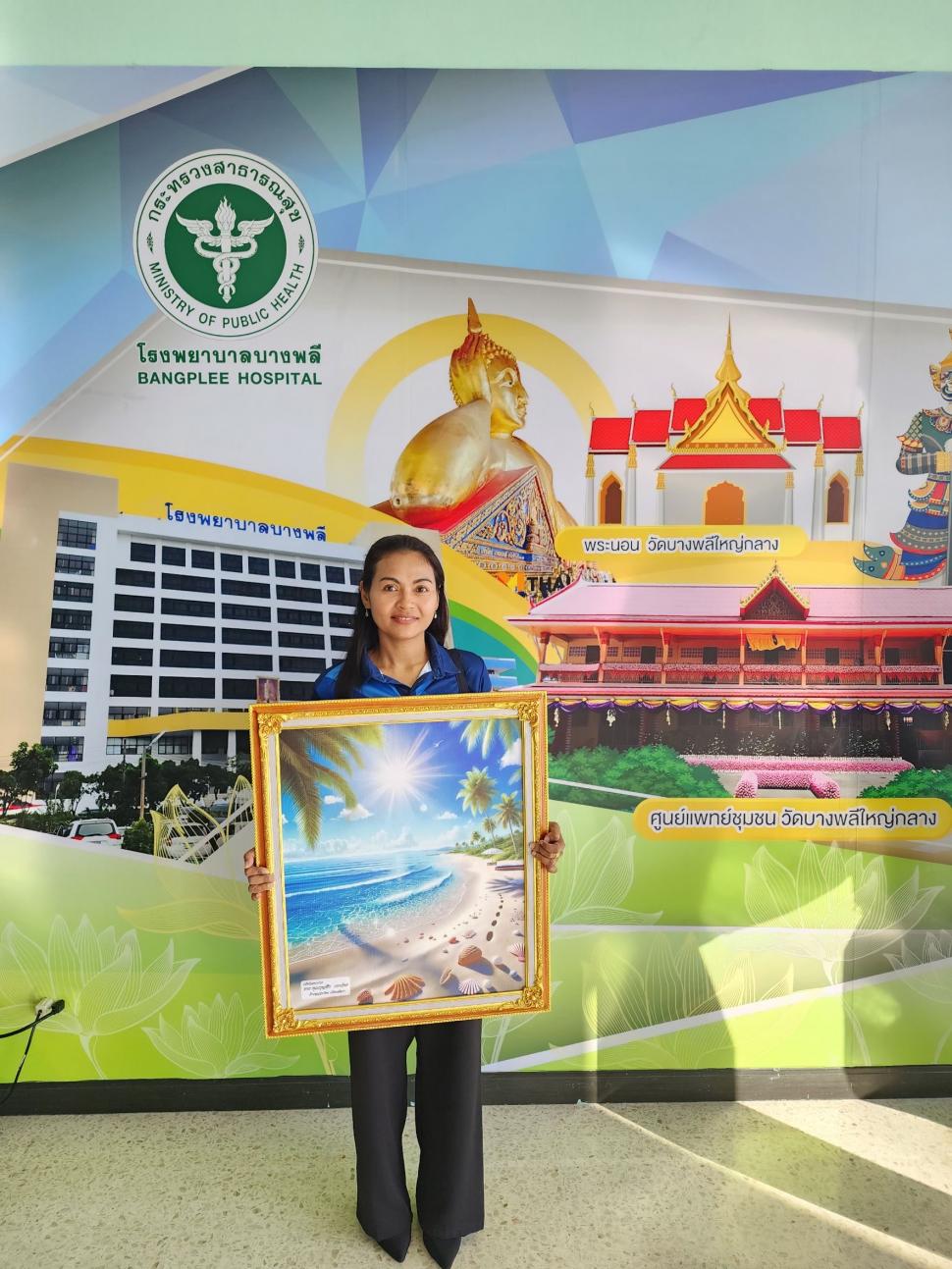 ______และภาพวาดภาพวิวทิวทัศน์ ต่างๆ เพื่อใช้ตกแด่งในโรงพยาบาลเพิ่มอีกจำนวน 5 ภาพ ต่อหนึ่ง โรงพยาบาล จะมอบให้กับโรงพยาบาลของรัฐทุกจังหวัดและในกรุงเทพอีก 30 กว่าโรงพยาบาล โดยเป็นศิลปะบ้าบัด และตกแต่ง โรงพยาบาลบางพลี อ.บางพลี จ.สมุทรปราการ