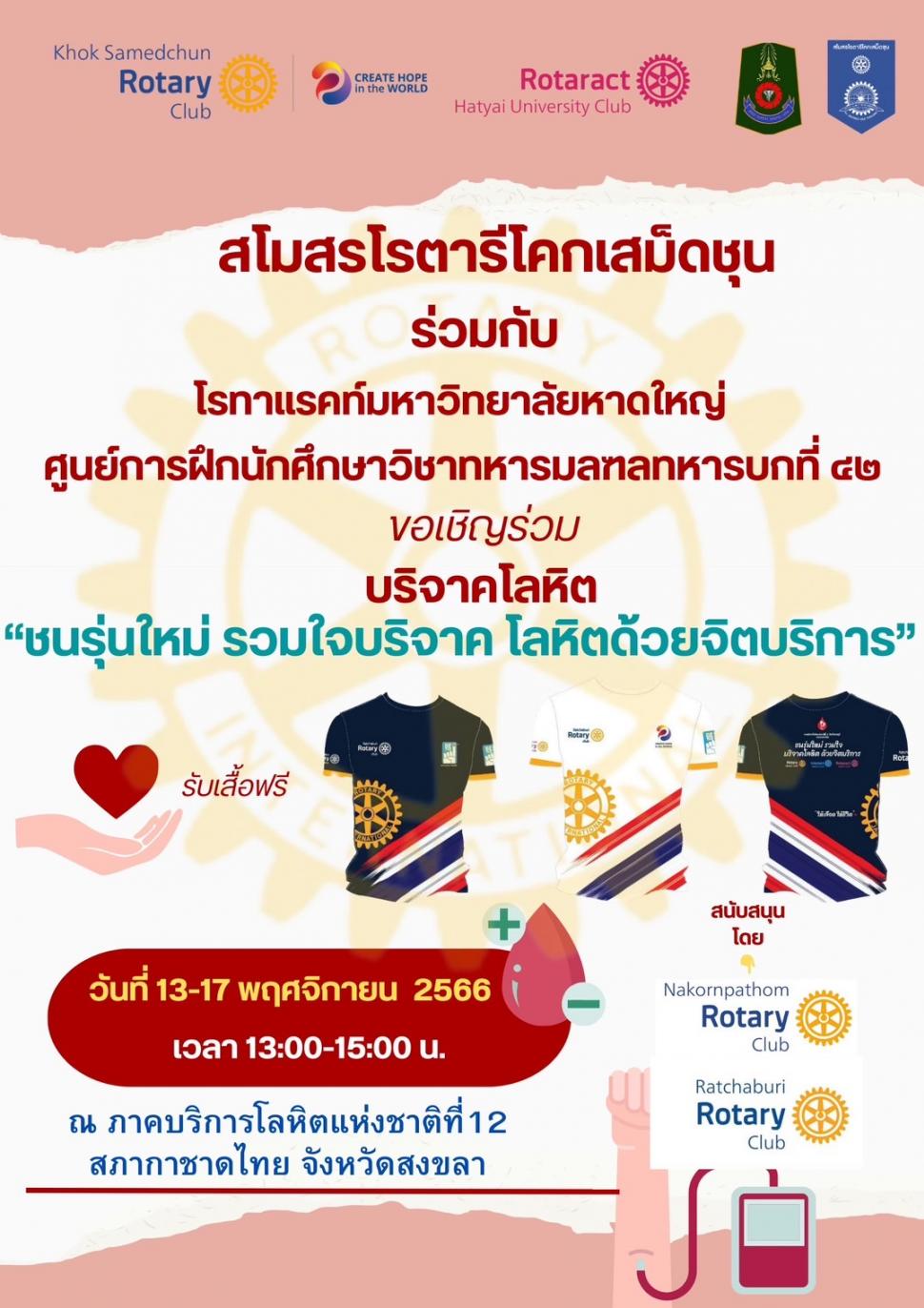 สโมสรโรตารีโคกเสม็ดชุน ร่วมกับ โรทาแรคท์มหาวิทยาลัยหาดใหญ่ ศูนย์การฝึกนักศึกษาวิชาทหารมลฑลทหารบกที่ ๔๒ ขอเชิญร่วม บริจาคโลหิต "ชนรุ่นใหม่ รวมใจบริจาค โลหิตด้วยจิตบริการ" วันที่ 13-17 พฤศจิกายน 2566