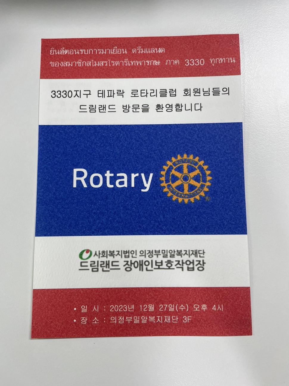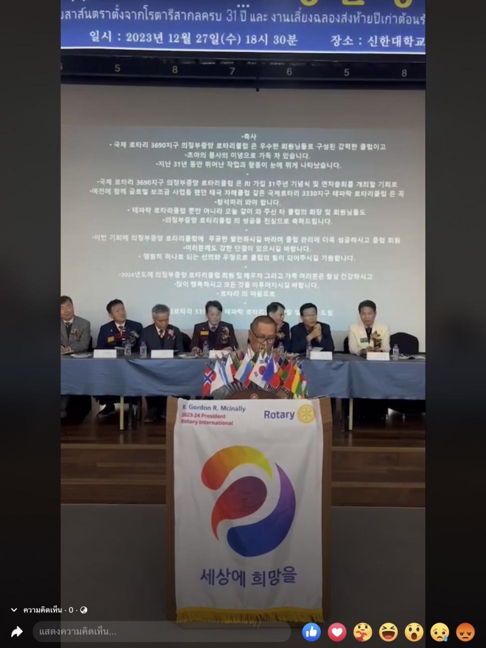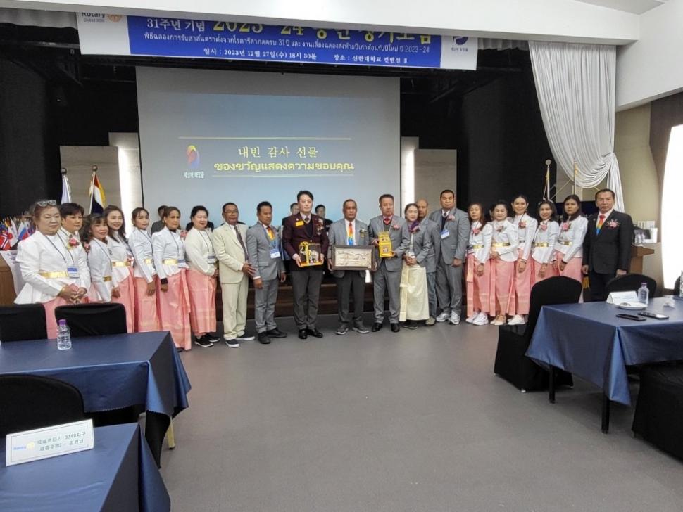 นยล.สิทธิพงษ์ โพธิ์เดช นายกรับเลือกสโมสรโรตารีเทพารักษ์ ปีโรตารี 2566-2567 ภาค 3330 และสมาชิกสโมสรฯ จำนวน 22 ท่าน เดินทางเข้าร่วมงานฉลองสาส์นตราตั้งจากโรตารีสากลครบ 31 ปี และงานเลี้ยงฉลองส่งท้ายปีเก่าต้อนรับปีใหม่ 2567 ของคู่มิตรสโมสรโรตารีอึยจองบูซุงอัง ภาค 3690 ประเทศเกาหลีใต้