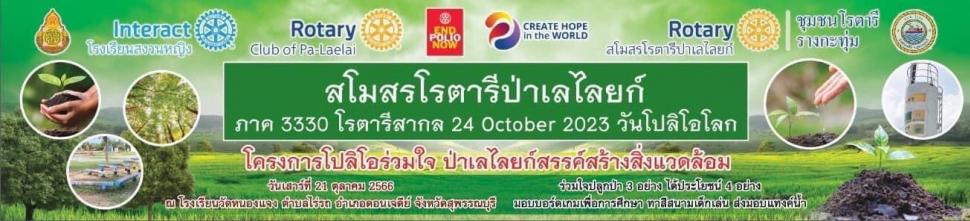 นายก ดร.กวิตา ปานล้ำเลิศ และสมาชิกสโมสรโรตารีป่าเลไลยก์ ภาค 3330 โรตารีสากล จัดโครงการโปลิโอร่วมใจ ป่าเลไลยก์สรรค์สร้างสิ่งแวดล้อม เนื่องในวันโปลิโอโลก วันที่ 24 ตุลาคม 2566 ร่วมกับสโมสรอินเทอร์แรคท์สงวนหญิง ชุมชน RCC รางกะทุ่ม โรงเรียนวัดหนองแจง องค์การบริหารส่วนตำบลไร่รถ และชุมชนโดยรอบ โดยผู้ช่วยฯนันทิยา พึ่งบุญ ณ อยุธยา ผู้ช่วยผู้ว่าการภาคพื้นที่ 30 เป็นประธานเปิดโครงการ ได้จัดกิจกรรมปลูกป่า 3 อย่าง ได้ประโยชน์ 4 อย่าง (ปลูกต้นไม้ยืนต้นรอบรั้วโรงเรียน และรอบสนามฟุตบอล ปลูกพืชผักสวนครัวเพื่อประกอบอาหารกลางวันให้น้อง) มอบบอร์ดเกมเพื่อการศึกษา และส่งมอบการย้ายแทงค์น้ำ ณ โรงเรียนวัดหนองเพียร ตำบลไร่รถ อำเภอดอนเจดีย์ จังหวัดสุพรรณบุรี