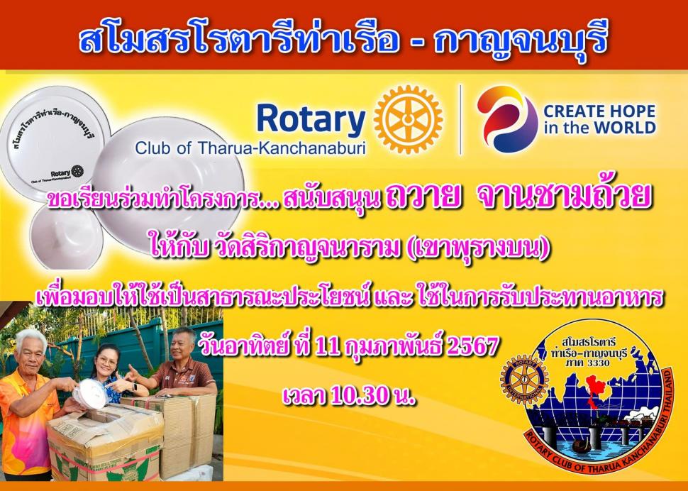 นายกสุชาติ และโรตารีแอนน์เตือนใจ เอกพัชรวรรณ จากสโมสรโรตารีสนามจันทร์ ร่วมพิธีเปิด โครงการ ถวาย ถ้วย จาน ชาม เพื่อใช้เป็นสาธารณะประโยชน์ และใช้ในการรับประทานอาหาร ให้กับวัดสิริกาญจนาราม (เขาพุรางบน) ซึ่งจัดโดย สโมสรโรตารีท่าเรือ-กาญจนบุรี เมื่อวันอาทิตย์ที่ 11 กุมภาพันธ์ 2567