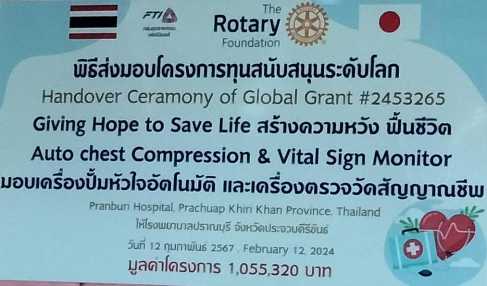 เวลา10.00น.สโมสรโรตารีหัวหิน นำโดย นายกศุภชัย ลูกชาย และสมาชิกสโมสรโรตารีหัวหิน ร่วมทำโครงการทุนสนับสนุนระดับโลก
