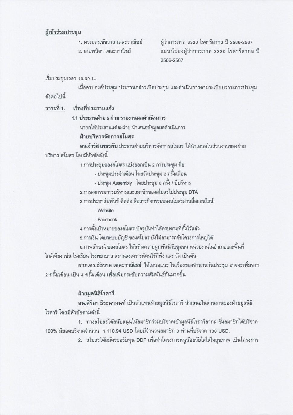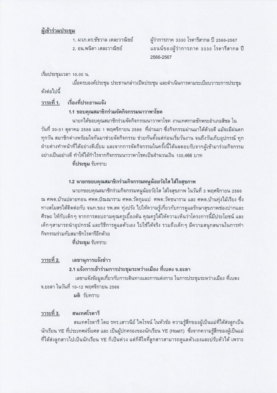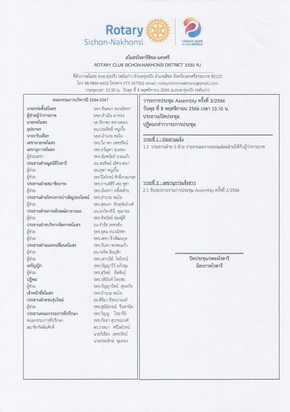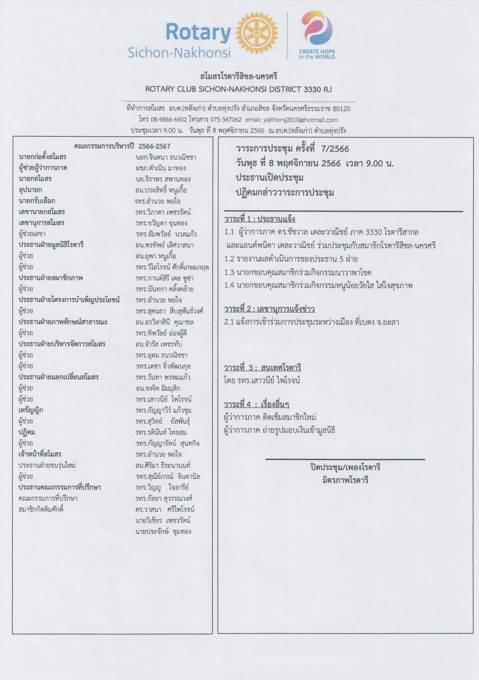 สโมสรโรตารีสิชล-นครศรี ประชุม ครั้งที่ 7/2566 ในวันพุธที่ 8 พฤศจิกายน 2566 ในการประชุมมีการต้อนรับผู้ว่าการภาคมาเยี่ยมชมสโมสร ได้มีการรายงานผลงานของแต่ละฝ่าย ต่อผู้ว่าการภาค มีการขอบคุณสมาชิกที่เข้าร่วมกิจกรรมนาววาพาโชค และกิจกรรมหนูน้อยวัยใส ใส่ใจสุขภาพ