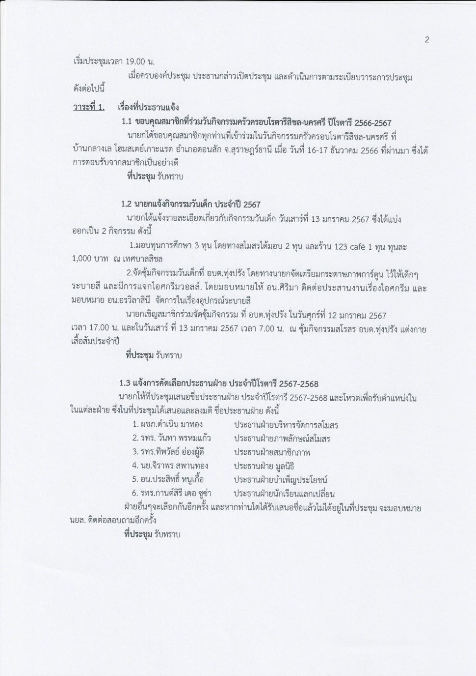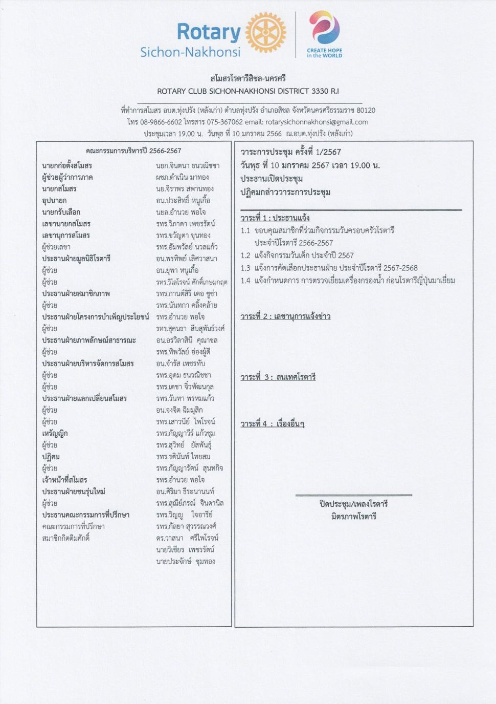 สโมสรโรตารีสิชล-นครศรี ประชุม ครั้งที่ 1/2567 ในวันพุธที่ 10 มกราคม 2567 นายกขอบคุณสมาชิกที่ร่วมกิจกรรมวันครอบครัว ประจำปีโรตารี 2566-2567 ได้มีการแจ้งกิจกรรมวันเด็ก และมีการคัดเลือกประธานฝ่าย ประจำปีโรตารี 2567-2568