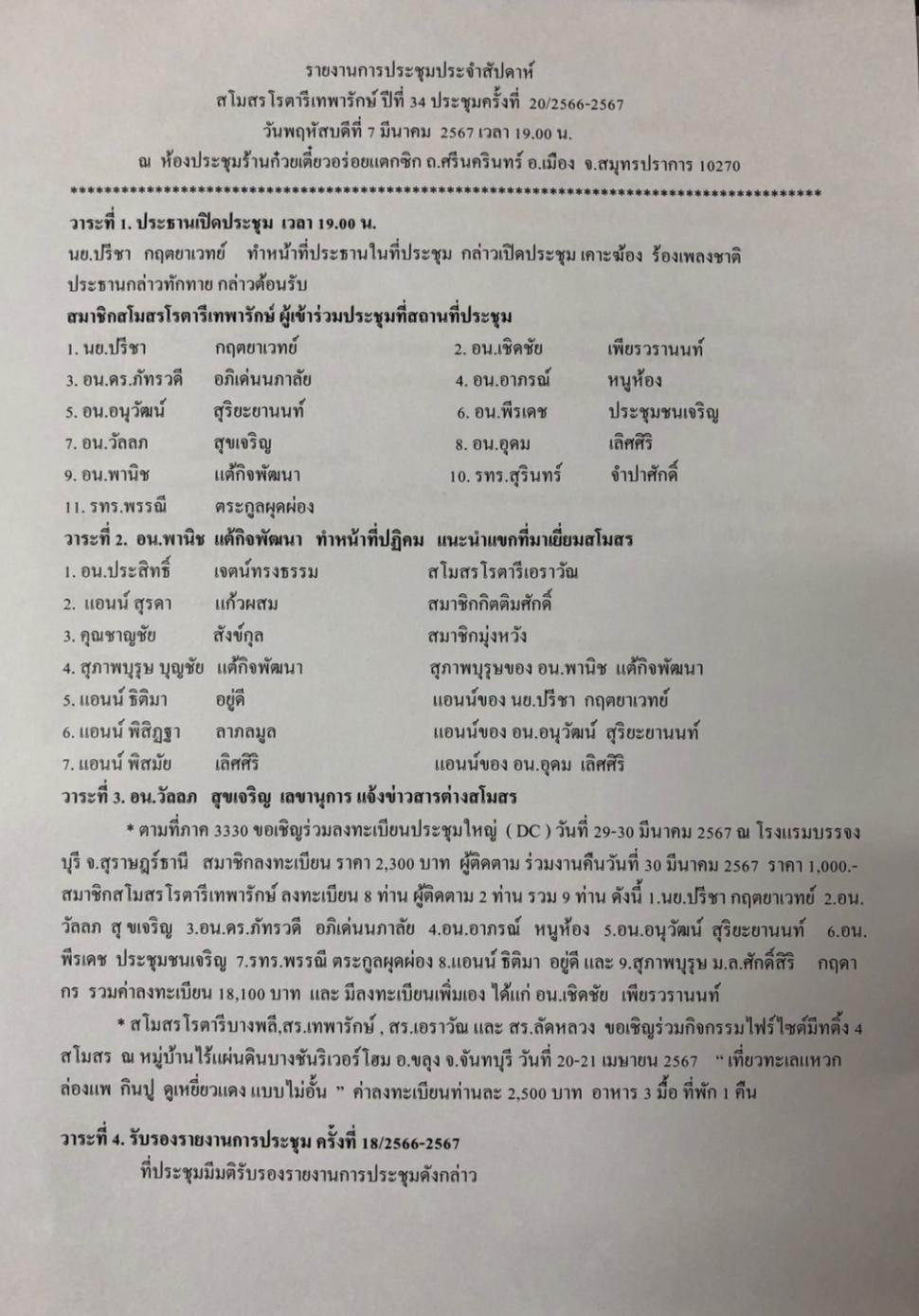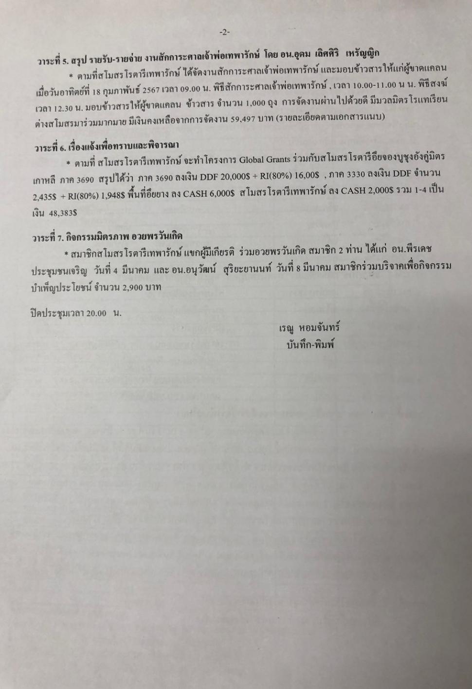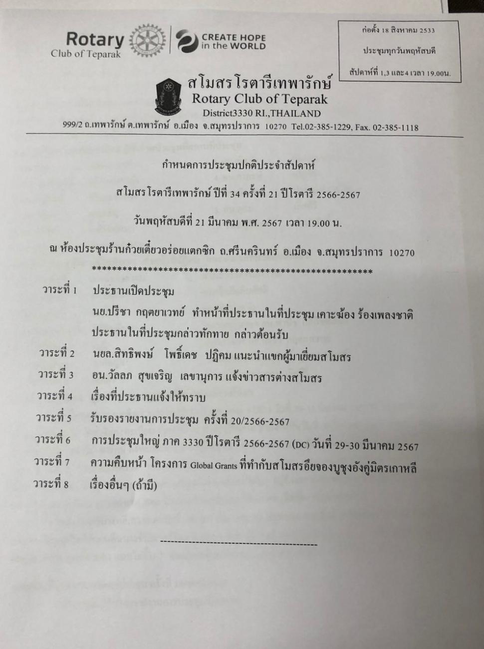 วันพฤหัสบดี ที่ 21 มีนาคม 2567 เวลา 19:30-20:30 น. ณ ห้องประชุมสโมสรฯ นายกปรีชา กฤตยาเวทย์ นายกสโมสรโรตารีเทพารักษ์ ปีโรตารี 2566-2567 และสมาชิกสโมสรฯ ประชุมประจำสัปดาห์ครั้งที่ 20/2566-2567 ในวาระต่างๆ ตามเอกสารแนบ นอกจากนี้แจ้งข่าวคืบหน้าการทำโครงการ Global Grant ร่วมกับคู่มิตรเกาหลี