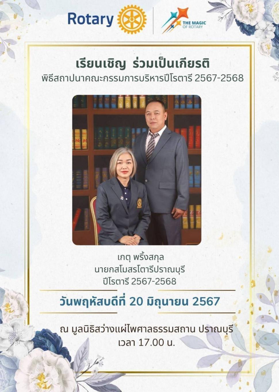 วันที่ 20 มิถุนายน 2567 สโมสรโรตารีสนามจันทร์ นำโดย นย.สุชาติ เอกพัชรวรรณ , นยล.ดร.เทวินทร์ บุบผาคำ  พร้อมด้วยสมาชิกสโมสรและแอนน์ ร่วมงานพิธีสถาปนานายกสโมสรโรตารีปราณบุรีและคณะกรรมการบริหาร รุ่น 120 ของปีโรตารี 2567-2568 ภาค 3330 ณ มูลนิธิสว่างแผ่ไพศาลธรรมสถาน ปราณบุรี