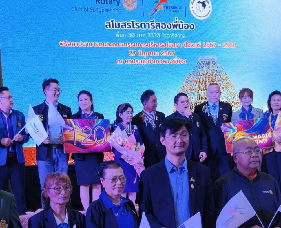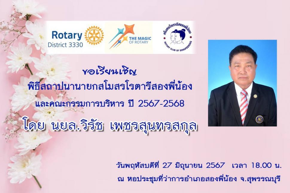 วันที่ 27 มิถุนายน 2567 สโมสรโรตารีสนามจันทร์ นำโดย นย.สุชาติ เอกพัชรวรรณ ,นยล.ดร.เทวินทร์ บุบผาคำ พร้อมด้วยสมาชิกสโมสรและแอนน์ ร่วมงานพิธีสถาปนา นายกวิรัช เพชรสุนทรสกุล นายกสโมสรโรตารีสองพี่น้อง และคณะกรรมการบริหาร รุ่น 120 ของปีโรตารี 2567-2568 ภาค 3330 ณ หอประชุมที่ว่าการอำเภอสองพี่น้อง จ.สุพรรณบุรี