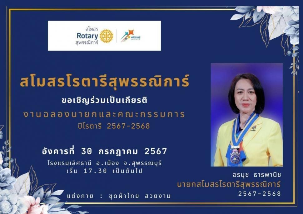 วันที่ 30 กรกฎาคม 2567 สโมสรโรตารีสนามจันทร์ นำโดย นายก ดร.เทวินทร์ บุบผาคำ พร้อมมวลมิตรโรแทเรียน ได้เข้าร่วมงานพิธีฉลองนายก ของ นายกอรนุช ธารพานิช นายกสโมสรโรตารีสุพรรณิการ์ และคณะกรรมการบริหาร รุ่น 120 ของปีโรตารี 2567-2568 ภาค 3330 ณ โรงแรมเลิศธานี อ.เมือง จ.สุพรรณบุรี