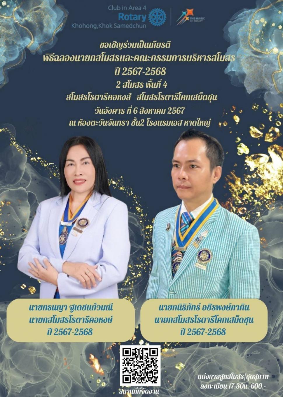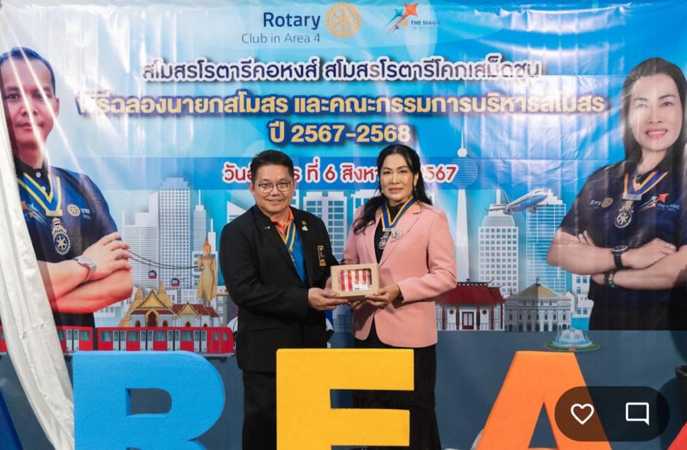 วันที่ 6 สิงหาคม 2567 สโมสรโรตารีสนามจันทร์ โดย นายก ดร.เทวินทร์ บุบผาคำ ได้เข้าร่วมงานฉลองนายกของสโมสรโรตารีคอหงส์และสโมสรโรตารีโคกเสม็ดชุน ณ ห้องตะวันจันทรา ชั้น 2 โรงแรมเอสหาดใหญ่ อ.หาดใหญ่ จ.สงขลา