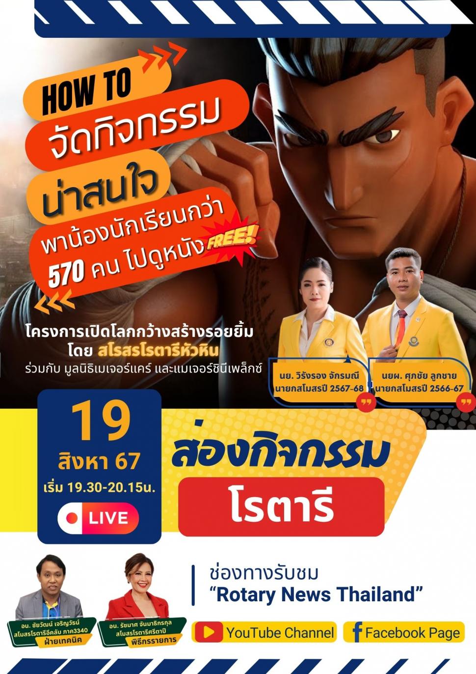 พบกับการนำเสนอและสนับสนุนกิจกรรมในโครงการ "เปิดกว้างสร้างรอยยิ้ม#9" ของสโมสรโรตารีหัวหิน สำหรับด้านเยาวชนโดยร่วมกับมูลนิธิเมเจอร์แคร์ และเมเจอร์ซินีเพล็กซ์