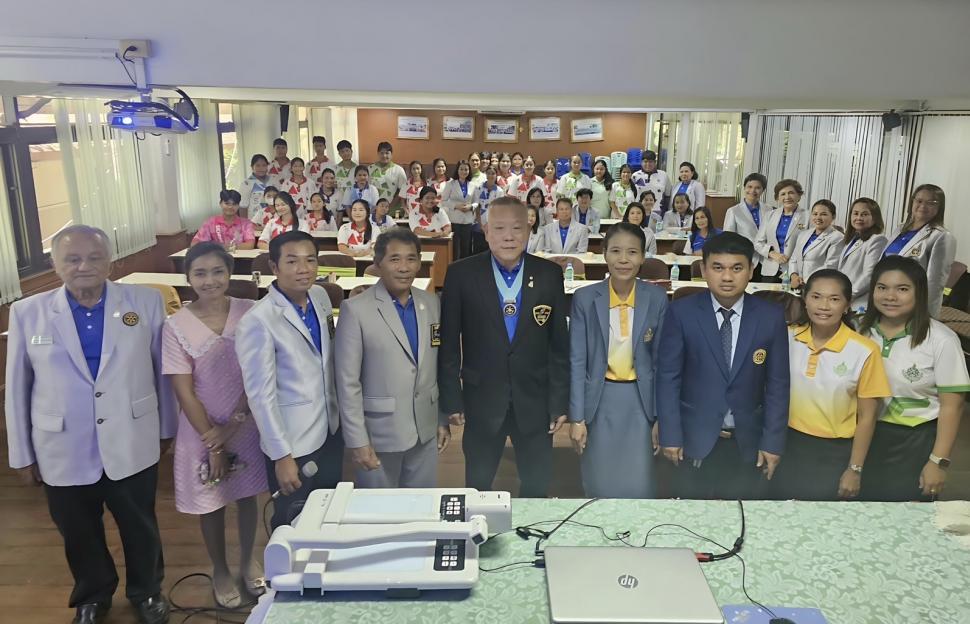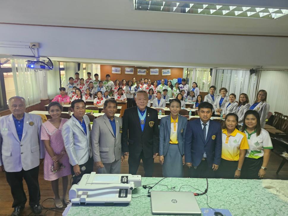 ท่านผู้ว่าการภาคติดเข็มให้สมาชิกใหม่ และรับมอบเงินบริจาค 100 เหรียญ จากสมาชิก