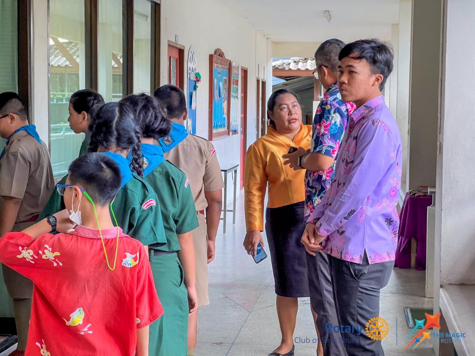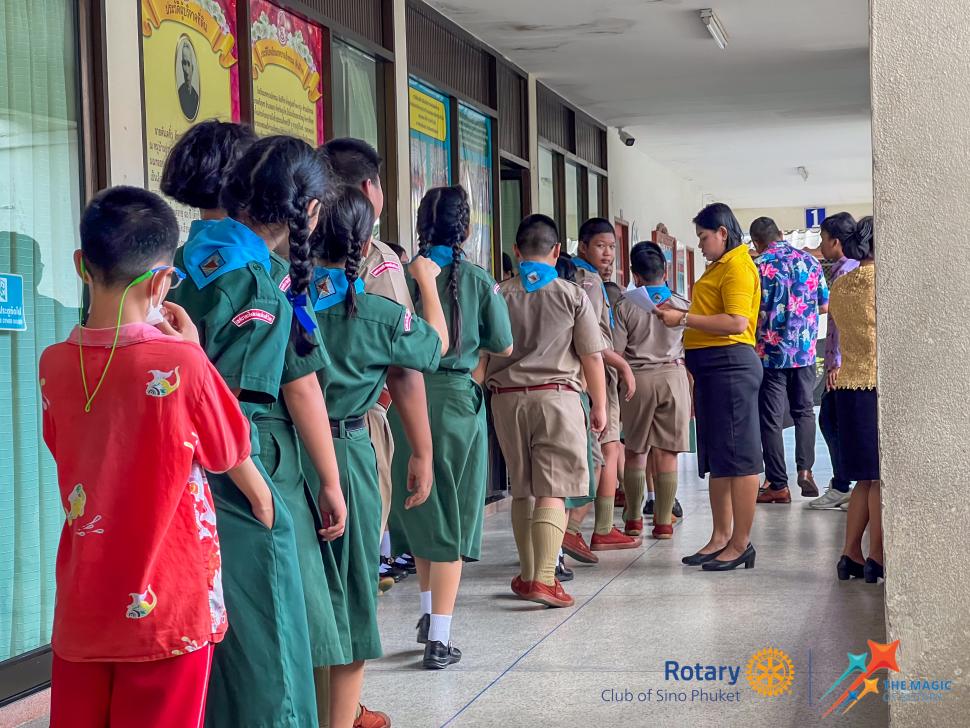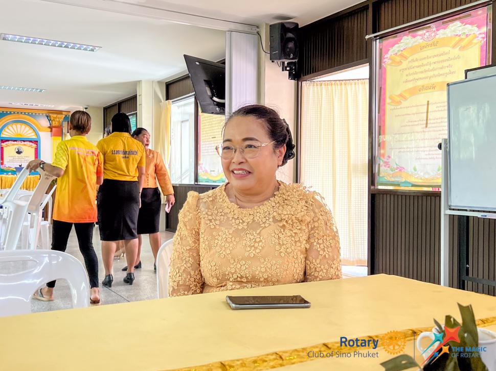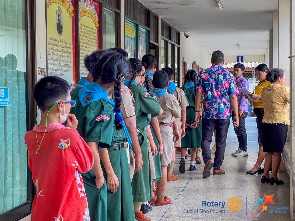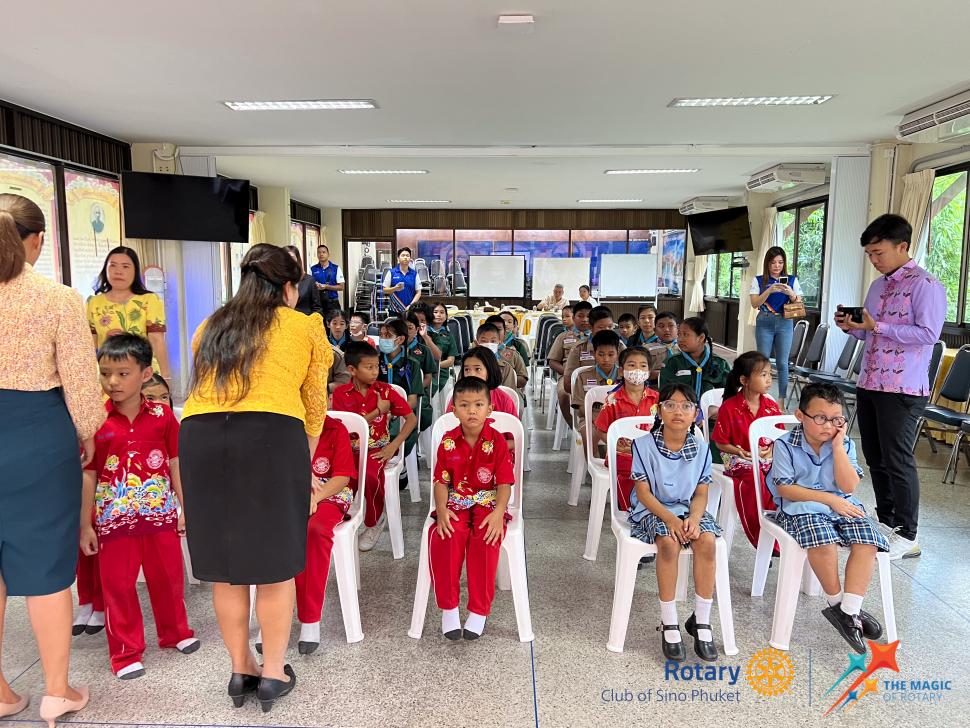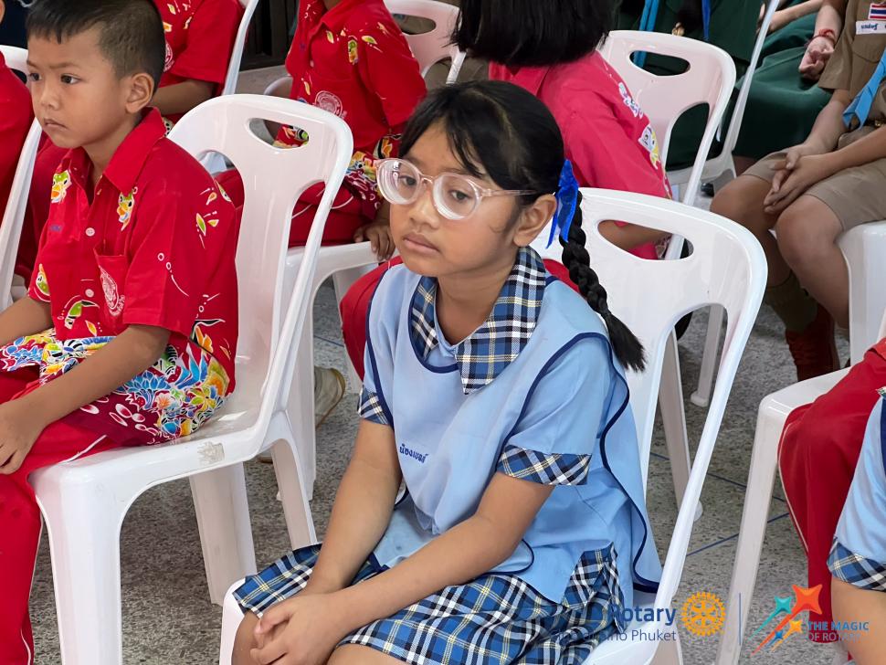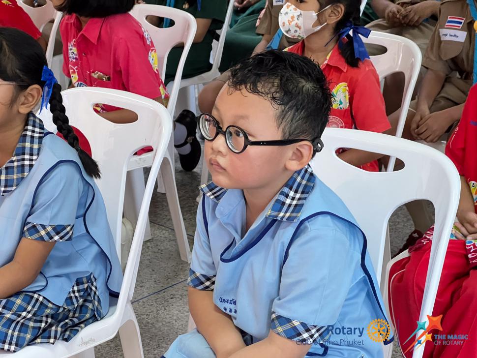 นายกเศวต โกยสมบูรณ์ สโมสรโรตารีชิโนภูเก็ต และสมาชิก ได้เข้ามอบแว่นตาจำนวน 60 ชิ้น ซึ่งมีร้านแว่นใกล้โรงเรียนที่เข้าร่วมโครงการ ให้ราคาพิเศษเพื่อสนับสนุนโครงการนี้ให้แก่เด็กนักเรียนที่มีปัญหาด้านสายตา Sangthong Eyesstudio โดยมี ผู้อำนวยการธนวรรณ อารีย์พงศ์ ได้จัดพิธีการมอบให้แว่นตาให้เด็กๆทุกคนภายในห้องประชุมโรงเรียน ซึ่งโครงการนี้มีเป้าหมาย คือ แก้ปัญหาเด็กที่ไม่ทราบว่าตัวเองมีค่าสายตา และเมื่อการมองเห็นดีขึ้น การเรียนก็จะดีขึ้นตามการมองเห็น ซึ่งได้รับการสนับสนุนเงินเพื่อจัดซื้อโดย สโมสรโรตารีป่าตองบีช Rotary Club of Patong Beach
