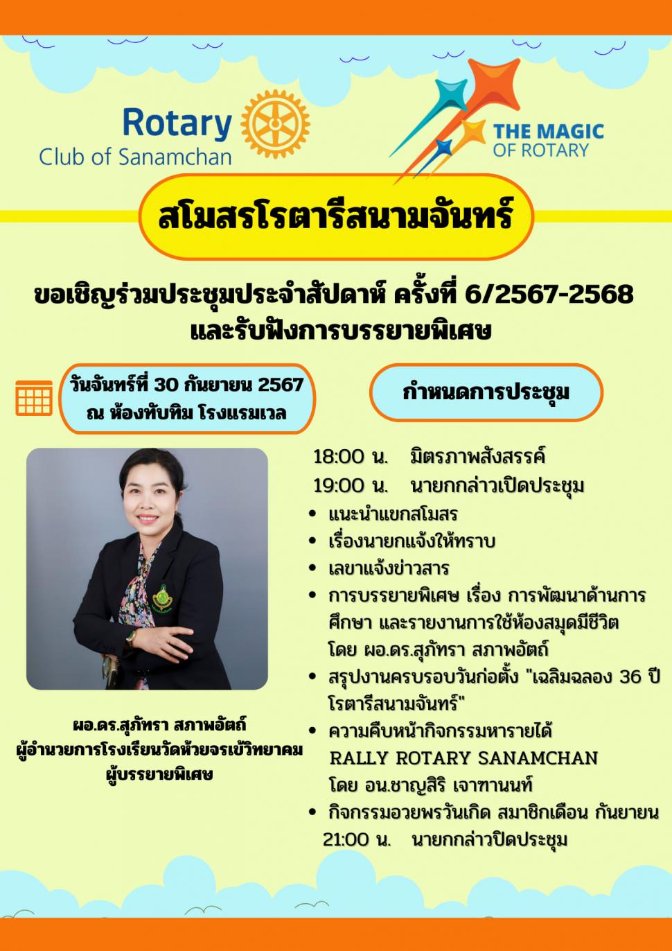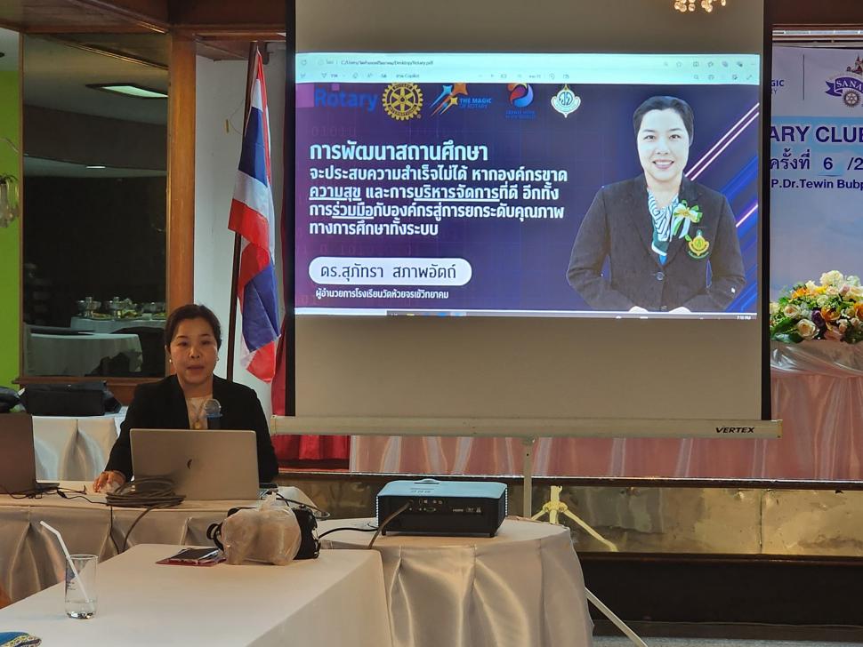 โดย ผอ.ดร.สุภัทรา สภาพอัตถ์ ( ผู้อำนวยการโรงเรียนวัดห้วยจรเข้วิทยาคม) และสรุปงาน " เฉลิมฉลอง 36 ปี โรตารีสนามจันทร์" และงาน Rally Rotary Sanamchan พร้อมปิดงานด้วยการเป่าเค้กสังสรรค์วันเกิดของสมาชิก เดือนกันยายนร่วมกัน