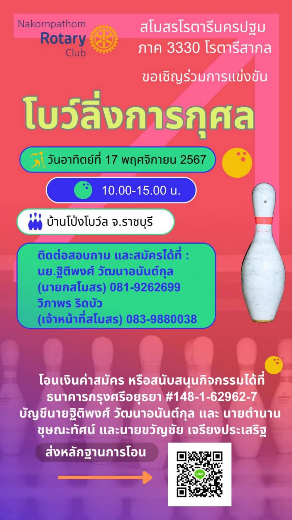 สโมสรโรตารีสนามจันทร์  นำโดยนย.ดร.เทวินทร์ บุบผาคำ พร้อมด้วยสมาชิก เข้าร่วมกิจกรรม การแข่งขันโบว์ลิ่งการกุศล ร่วมกับสโมสรโรตารีนครปฐม ณ บ้านโป่งโบว์ล จ.ราชบุรี