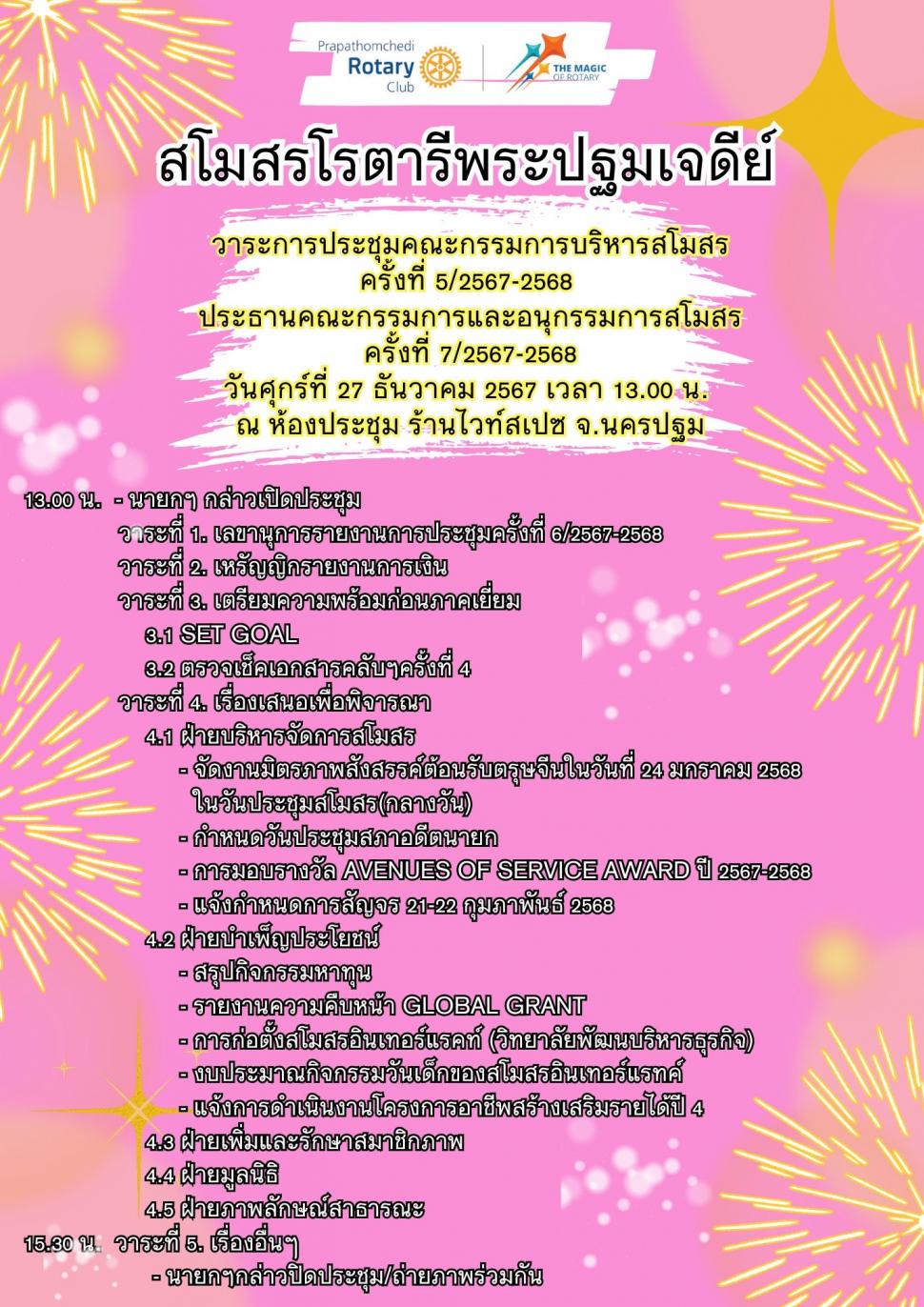 27 ธค.67 สโมสรโรตารีพระปฐมเจดีย์ จัดประชุมคณะกรรมการบริหารและคณะอนุกรรมการประจำเดือนธันวาคม