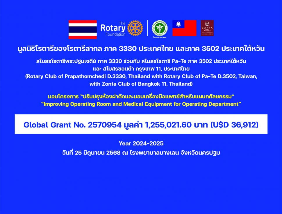 วันที่ 25 มิถุนายน 2568 สโมสรโรตารีสนามจันทร์ นำโดย นยล.สุกิจ นิยมทรัพย์ พร้อมด้วยอดีตนายกและสมาชิกสโมสรฯ เข้าร่วมพิธีมอบเครื่องมือและอุปกรณ์ในห้องผ่าตัด โครงการ GG2570954 ของสโมสรโรตารีพระปฐมเจดีย์ ที่ร่วมกับสโมสรโรตารี Bucheon Mogryun ภาค 3690 ประเทศเกาหลีใต้ ณ ห้องประชุมชั้น 4 โรงพยาบาลบางเลน อำเภอบางเลน จังหวัดนครปฐม