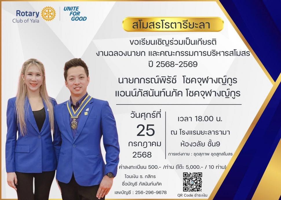 วันที่ 25 กรกฎาคม 2568 นายกพีระพรรณ มหาธนานุสรณ์ นายกสโมสรโรตารีบ้านแพ้ว และเพื่อนนายกในพื้นที่ตอนบน ร่วมงานฉลองนายกและคณะกรรมการสโมสรโรตารียะลา ณ โรงแรมยะลารามา อ.เมือง จ.ยะลา