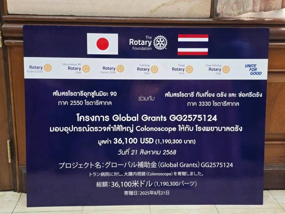 วันที่ 21 สิงหาคม 2568 นับเป็นวันสำคัญของ 3 สโมสรโรตารีในจังหวัดตรัง เพราะโครงการ Global Grant การมอบกล้องส่องลำไส้ใหญ่เพื่อคัดกรองมะเร็งลำไส้เบื้องต้นให้กับโรงพยาบาลตรัง ประสบความสำเร็จด้วยดี