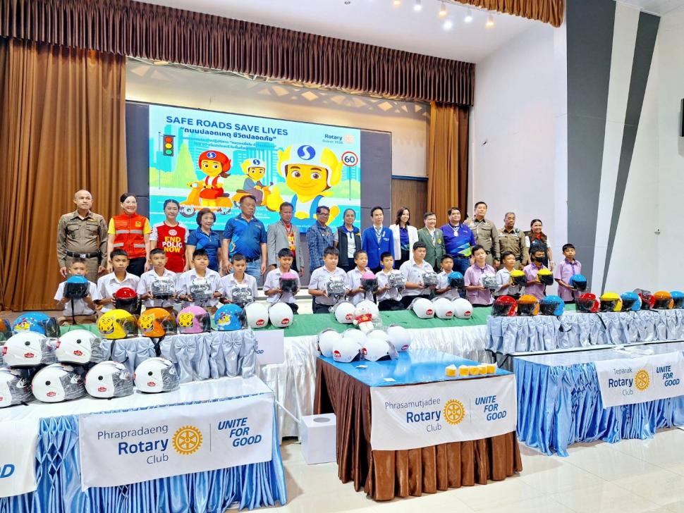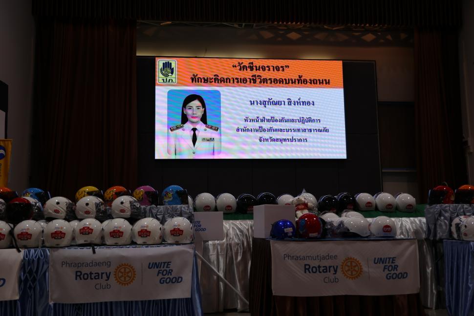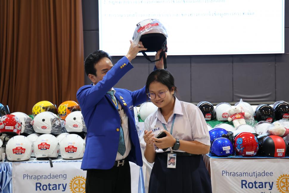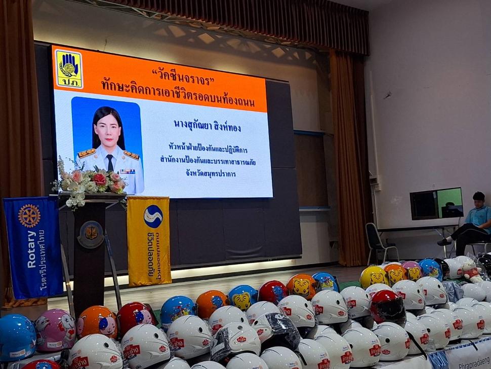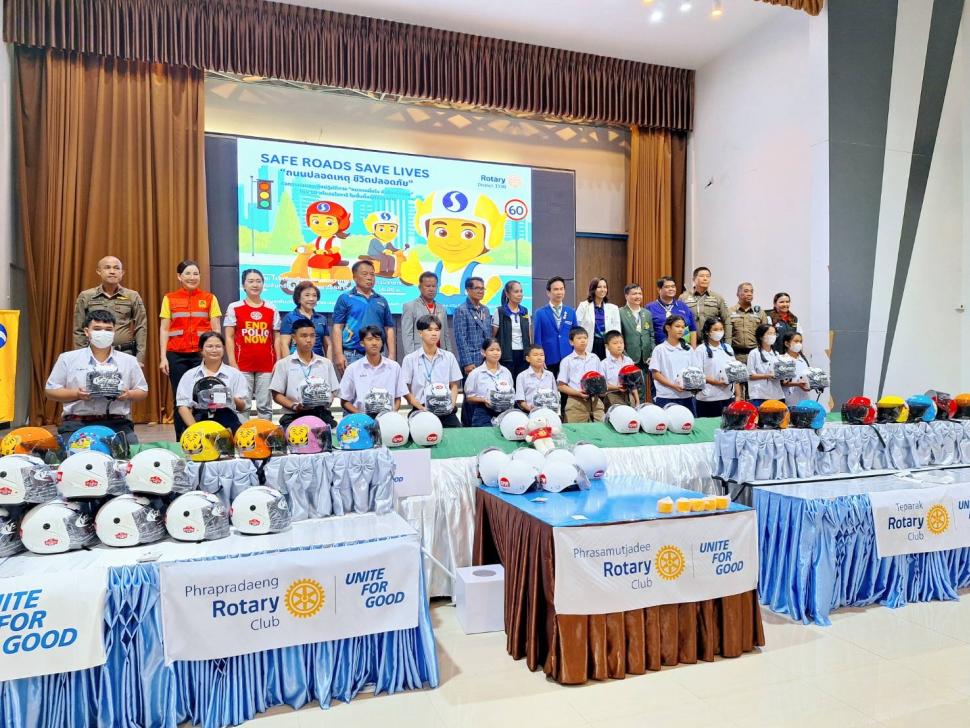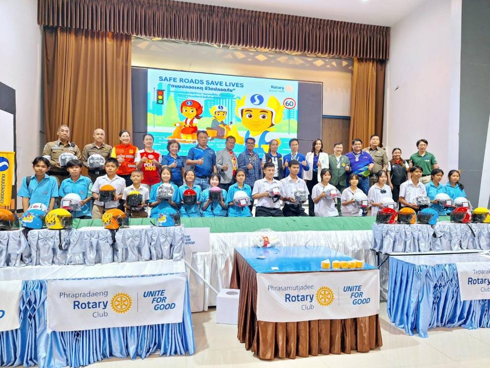 วันที่ 15 กันยายน 2568 เวลา 13.30-16.00 น. นย.พีรเดช ประชุมชนเจริญ นายกสโมสรโรตารีเทพารักษ์ ภาค 3330 พื้นที่ 22 ปีโรตารี 2568-2569 และสมาชิกสโมสรฯ ร่วมเปิดโครงการอบรมเชิงปฏิบัติการ “หมวกหนึ่งใบ หัวใจหนึ่งดวง” ภายใต้โครงการ Safe Roads Save Lives “ถนนปลอดเหตุ ชีวิตปลอดภัย” ณ ห้องประชุมใหญ่ โรงเรียนป้อมนาคราชสวาทยานนท์ อำเภอพระสมุทรเจดีย์ จังหวัดสมุทรปราการ โดยสโมสรโรตารีพระสมุทรเจดีย์ เป็นเจ้าภาพหลักจับมือกับสโมสรโรตารีในจังหวัดสมุทรปราการอีก 9 สโมสร