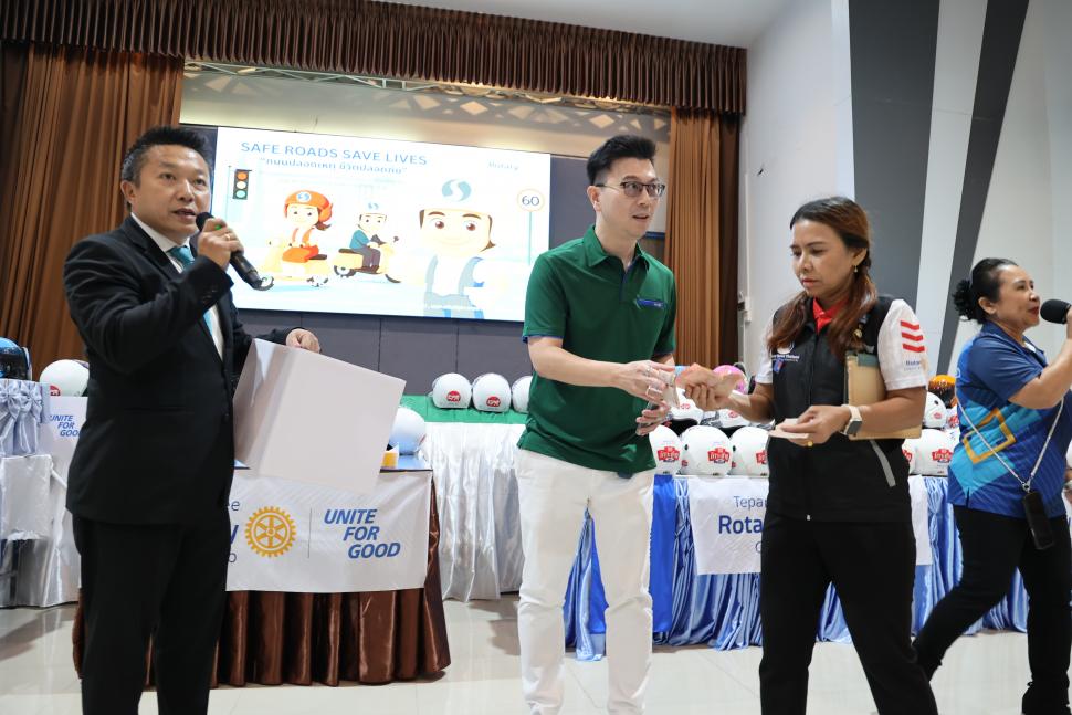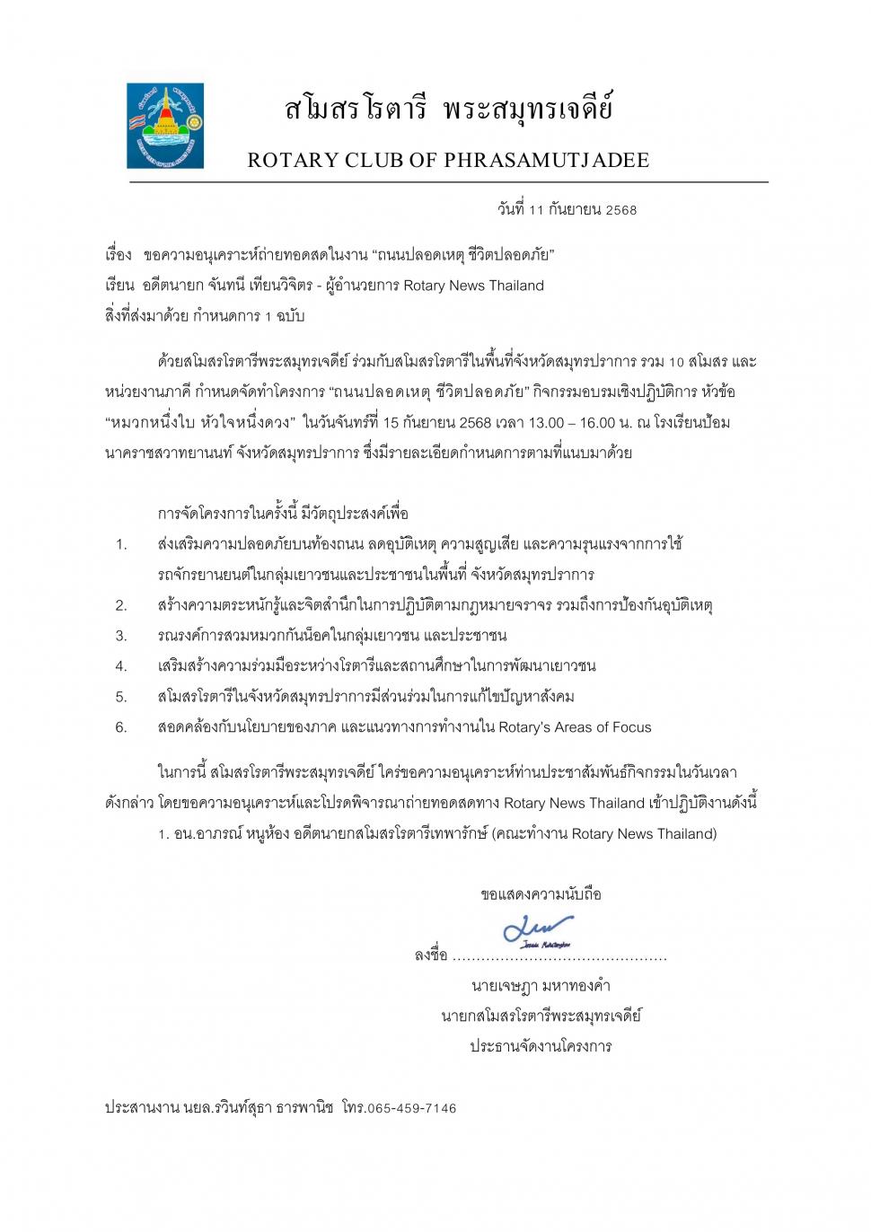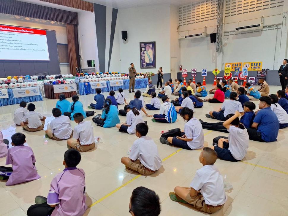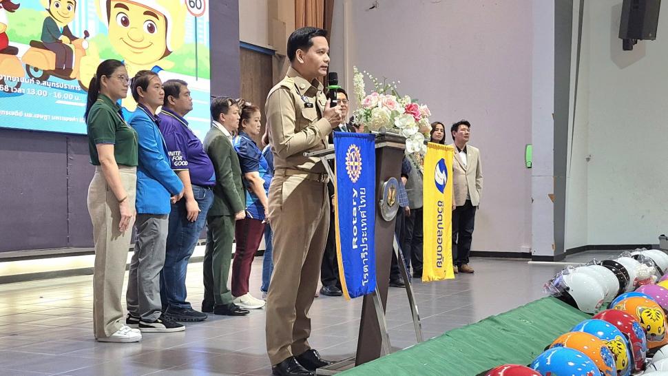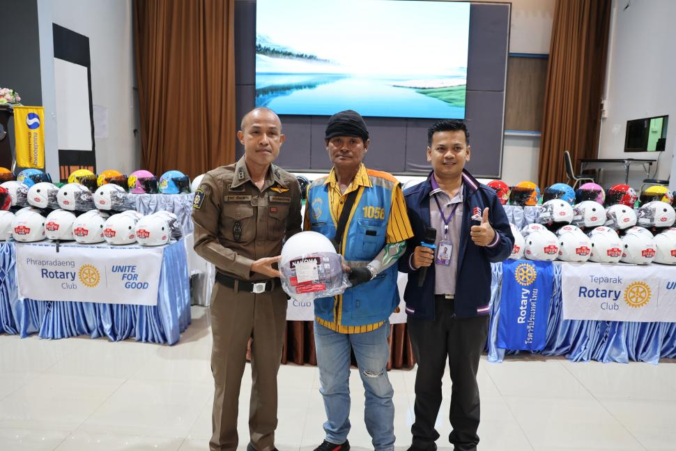 วันที่ 15 กันยายน 2568 เวลา 13.30-16.00 น. นย.พีรเดช ประชุมชนเจริญ นายกสโมสรโรตารีเทพารักษ์ ภาค 3330 พื้นที่ 22 ปีโรตารี 2568-2569 และสมาชิกสโมสรฯ ร่วมเปิดโครงการอบรมเชิงปฏิบัติการ “หมวกหนึ่งใบ หัวใจหนึ่งดวง” ภายใต้โครงการ Safe Roads Save Lives “ถนนปลอดเหตุ ชีวิตปลอดภัย” ณ ห้องประชุมใหญ่ โรงเรียนป้อมนาคราชสวาทยานนท์ อำเภอพระสมุทรเจดีย์ จังหวัดสมุทรปราการ โดยสโมสรโรตารีพระสมุทรเจดีย์ เป็นเจ้าภาพหลักจับมือกับสโมสรโรตารีในจังหวัดสมุทรปราการอีก 9 สโมสร