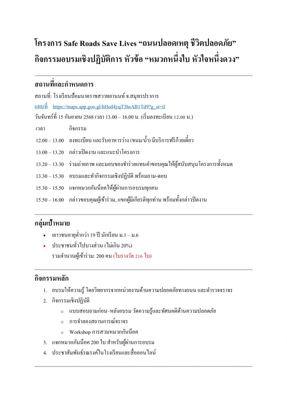 ???? โครงการนี้มุ่งหวังให้เยาวชนและชุมชนตระหนักถึงความสำคัญของการใช้ถนนอย่างปลอดภัย ลดการสูญเสียจากอุบัติเหตุ และสร้างวัฒนธรรมการสวมหมวกกันน็อกให้หยั่งรากลึกในสังคมไทย