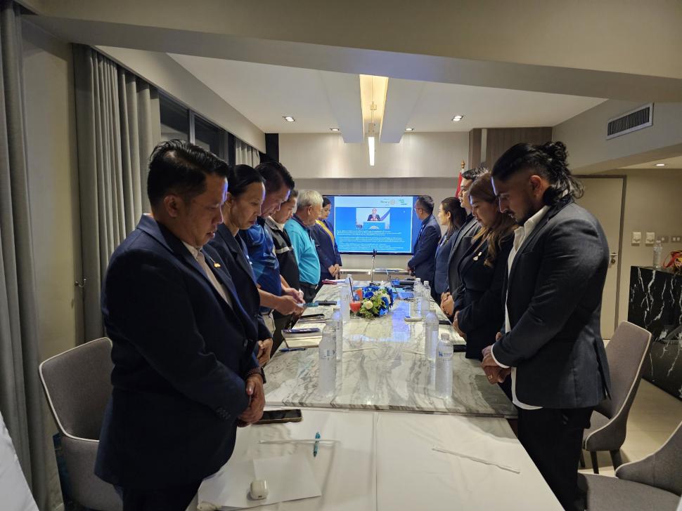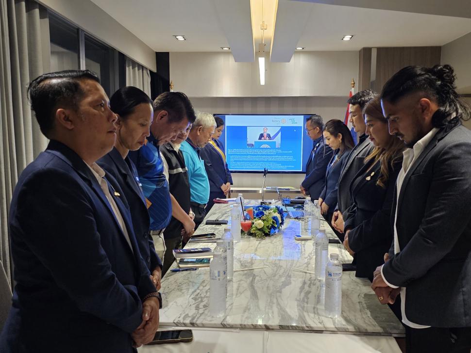 ปิดท้ายก่อนการเคาะฆ้องการประชุม มวลมิตรสโมสรฯร่วมยืนไว้อาลัย แก่ประธานรับเลือก โรตารีสากล Mr.SangKoo Yun จาก Rotary Club of Sae Hanyang, Seoul, Korea, ที่ได้จากไป ในวันที่ 5 ก.ย. ที่ผ่านมา