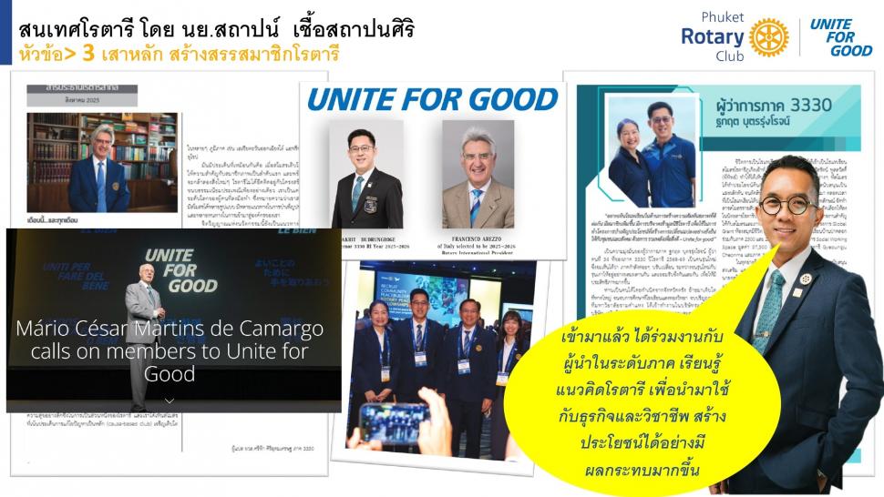 ปฐมนิเทศจากอดีตนายกฯ & เรียนรู้การปฏิบัติหน้าที่ในสโมสรฯ จนก้าวสู่การเป็นนายกฯ โดยได้นำหลักคิด อุดมการณ์ การใช้วิสัยทัศน์และพันธกิจของผู้นำโรตารีสากล และผู้ว่าการภาค 3330 กลับมาเน้นย้ำ 3 เสาหลักอันได้แก่
