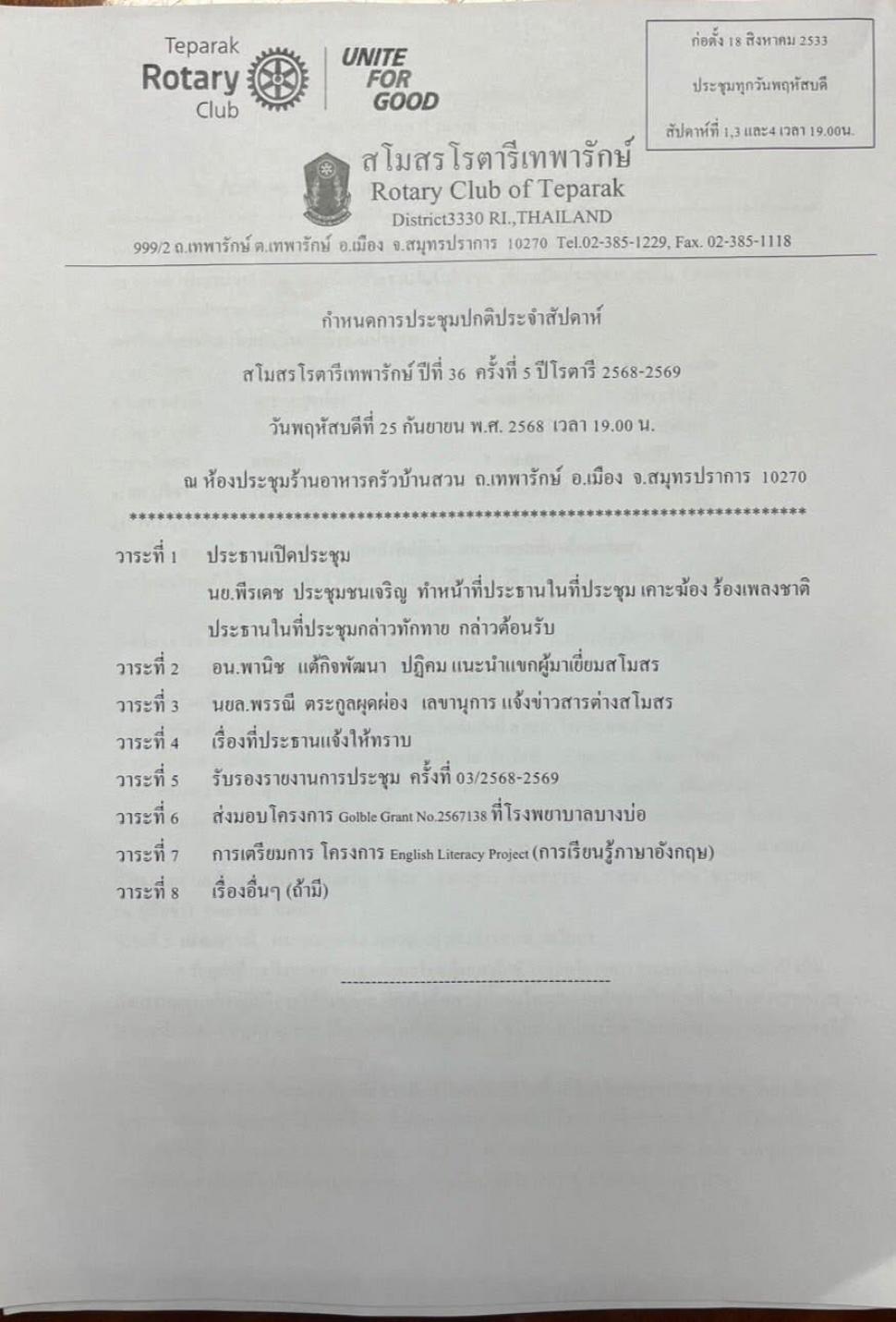 สืบเนื่องการประชุมประจำสัปดาห์ สโมสรโรตารีเทพารักษ์