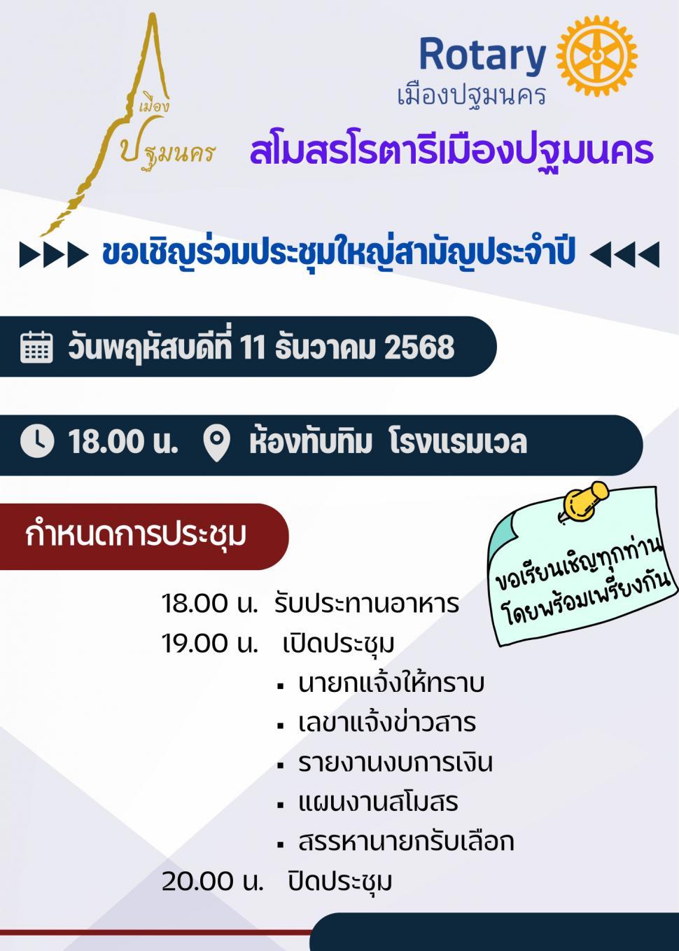 .. สโมสรโรตารีเมืองปฐมนคร ประชุมใหญ่สามัญประจำปี 2568-2569 ในวันที่ 11 ธันวาคม 2568 ณ ห้องทับทิม โรงแรมเวล นครปฐม