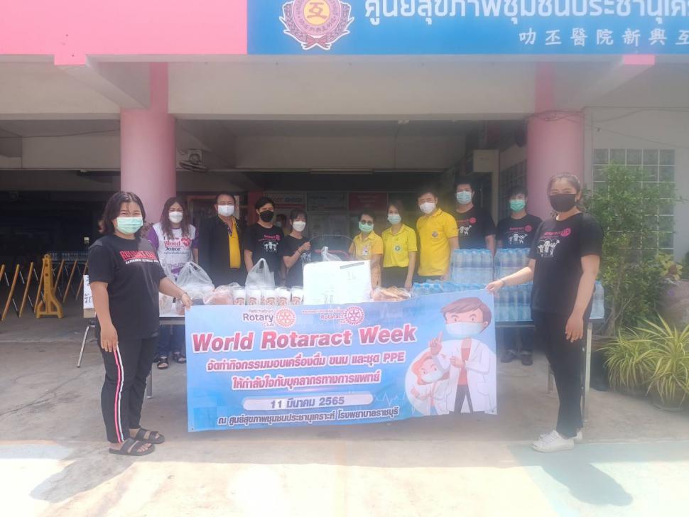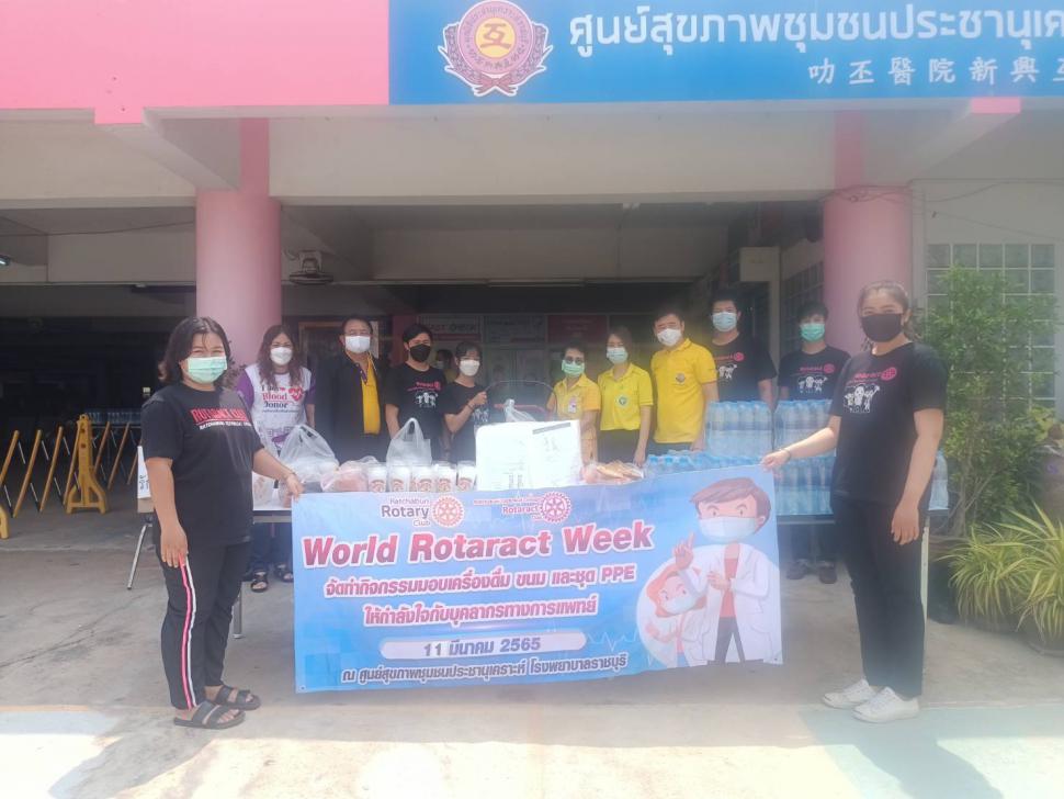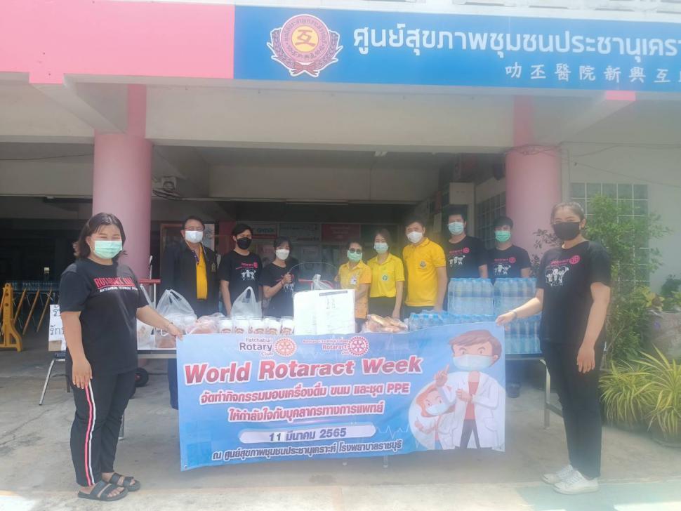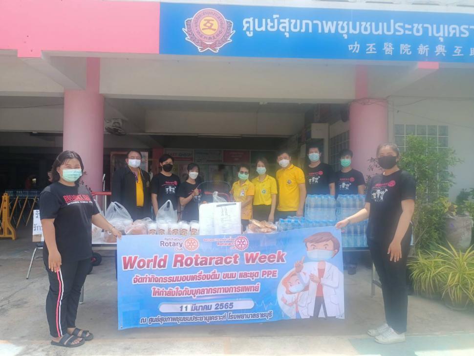 วันที่ 11 มีนาคม 2565 นย.จิราวุฒิ แซ่ตั้ง นายกสโมสรโรตารีราชบุรี ปีบริหาร 2564-65 และสโมสรโรทาแรคท์วิทยาลัยเทคนิคราชบุรี ร่วมมอบเครื่องดื่ม ขนม และชุด PPE เนื่องในวัน "World Rotaract Day" ให้แก่บุคคลากรทางการแพทย์ ณ ศูนย์สุขภาพชุมชนประชานุเคราะห์ โรงพยาบาลราชบุรี