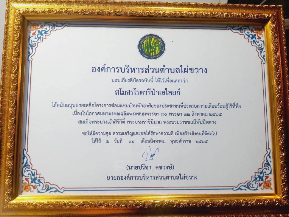 สโมสรโรตารีป่าเลไลยก์ได้รับมอบใบประกาศเกีรยติคุณจาก องค์การบริหารส่วนตำบลไผ่ขวาง อ.เมือง จ.สุพรรณบุรี ที่ได้ร่วมสนับสนุนช่วยเหลือโครงการซ่อมแซมบ้านพักอาศัยของประชาชนที่ประสบความเดือดร้อนผู้ไร้ที่พึ่ง เมื่อวันที่ 12 สค 65 ณ. อบต.ไผ่ขวาง จ.สุพรรณบุรี