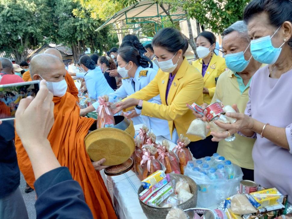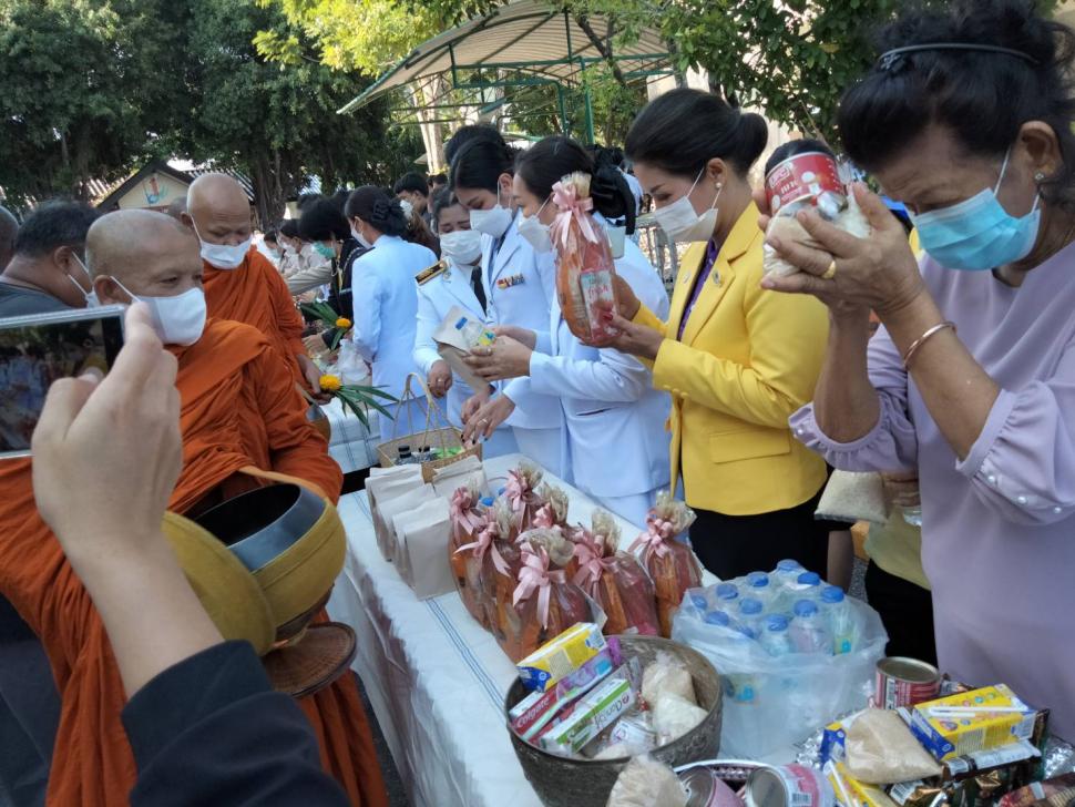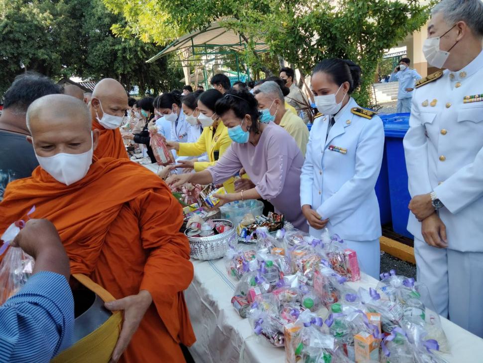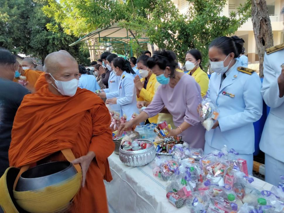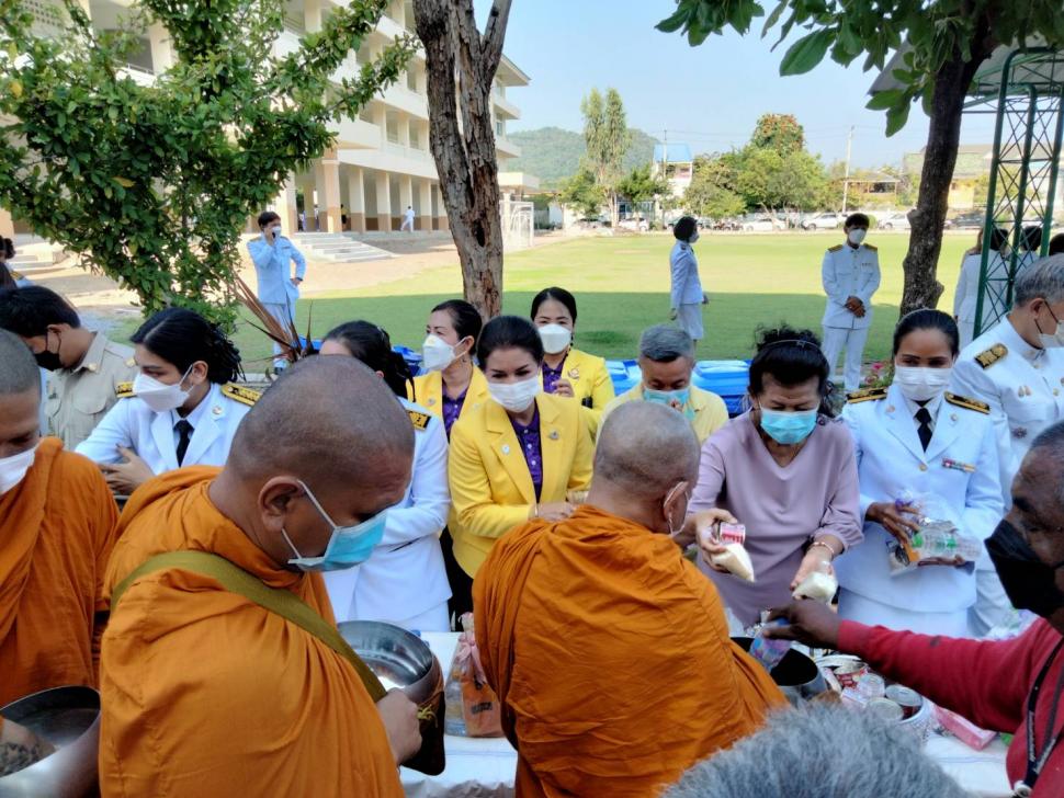 -ช่วงเช้า-เวลา 07:09พิธีสวดพระพุทธมนต์และตักบาตรข้าวสารอาหารแห้งและพิธีวางพวงมาลาถวายบังคมณ.อาคารอเนกประสงค์โดมโรงเรียนหัวหิน