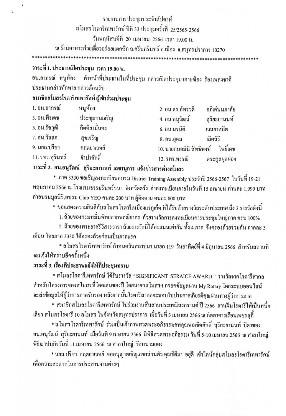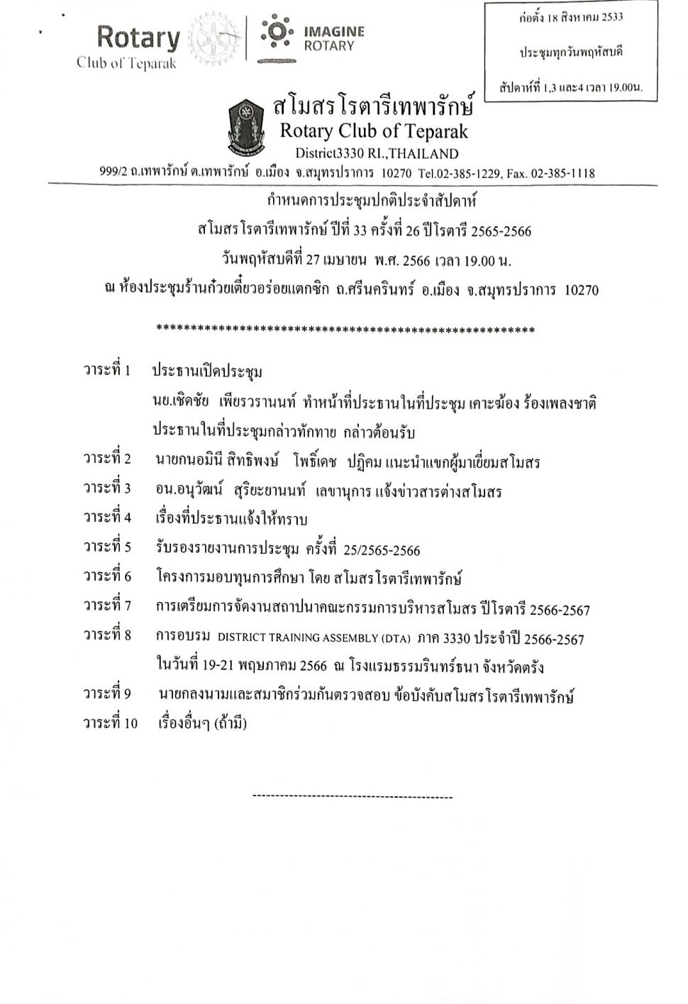 วันพฤหัสบดี ที่ 27 เมษายน 2566 เวลา 19:00 น. ณ ห้องประชุมสโมสรโรตารีเทพารักษ์ นำโดย นายก เชิดชัย เพียรวรานน์ นายกสโมสรโรตารีเทพารักษ์ ปีโรตารี 2565-2566 และสมาชิกสโมสรฯ ตามวาระการประชุมเอกสารแนบ ดังข้างล่างนี้