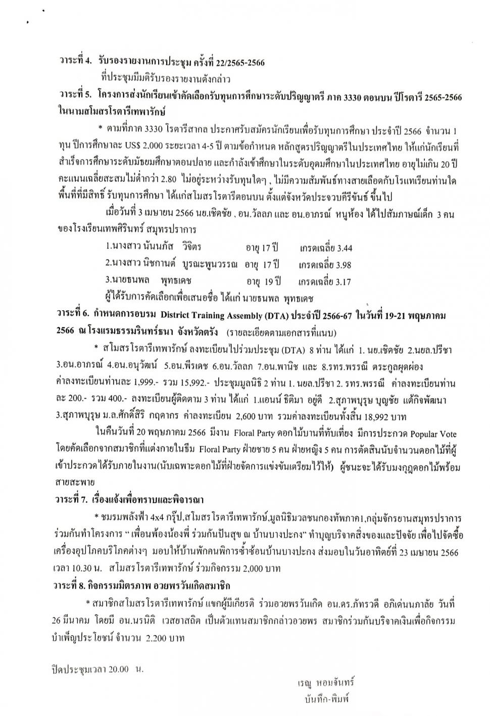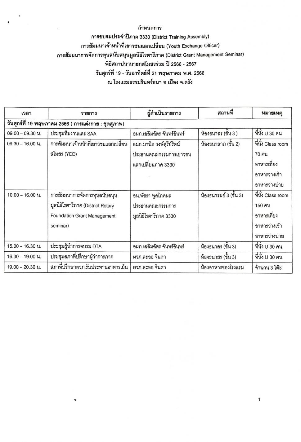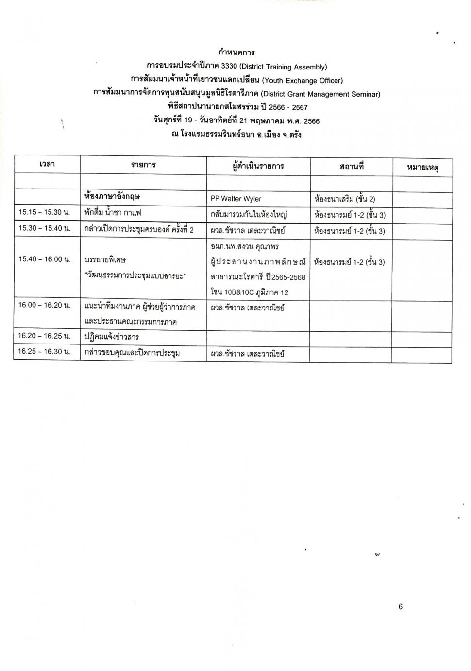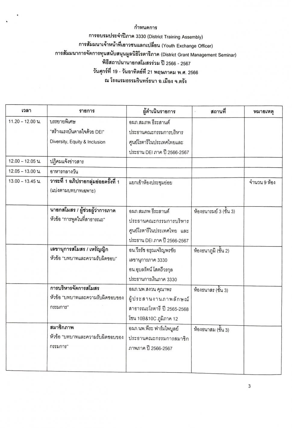 -การประชุม DISTRICT TRAINING ASSEMBLY (DTA)การอบรมภาค 3330 ประจำปี 2566-2567 วันที่ 19-21 พฤษภาคม2566 ณ โรงแรมธรรมรินทร์ธนา จ.ตรัง ได้ลงทะเบียนเข้าประชุมทั้งหมด 11 ท่าน