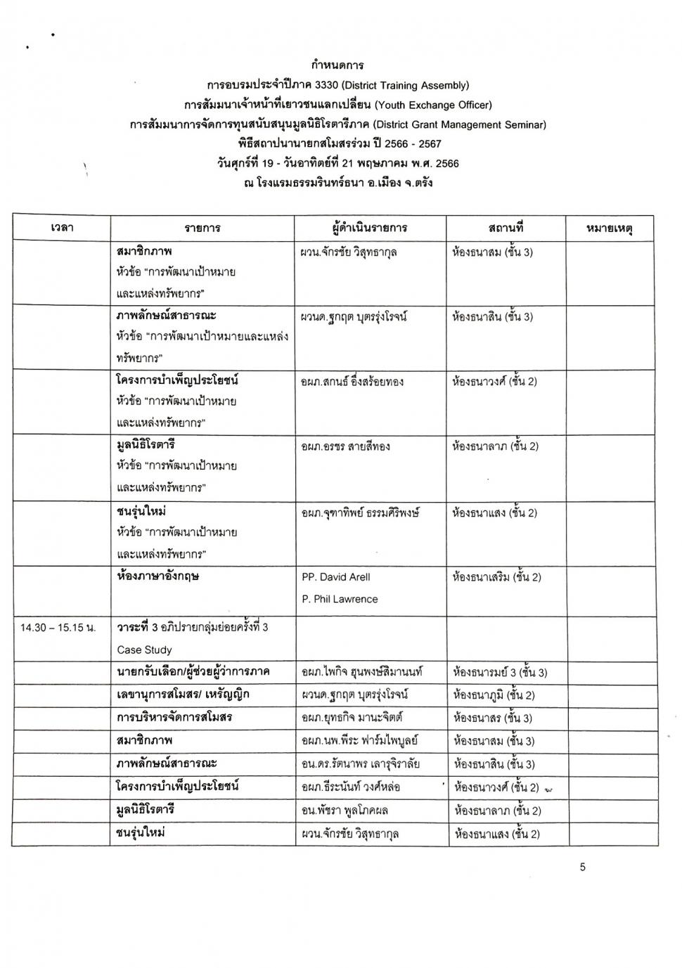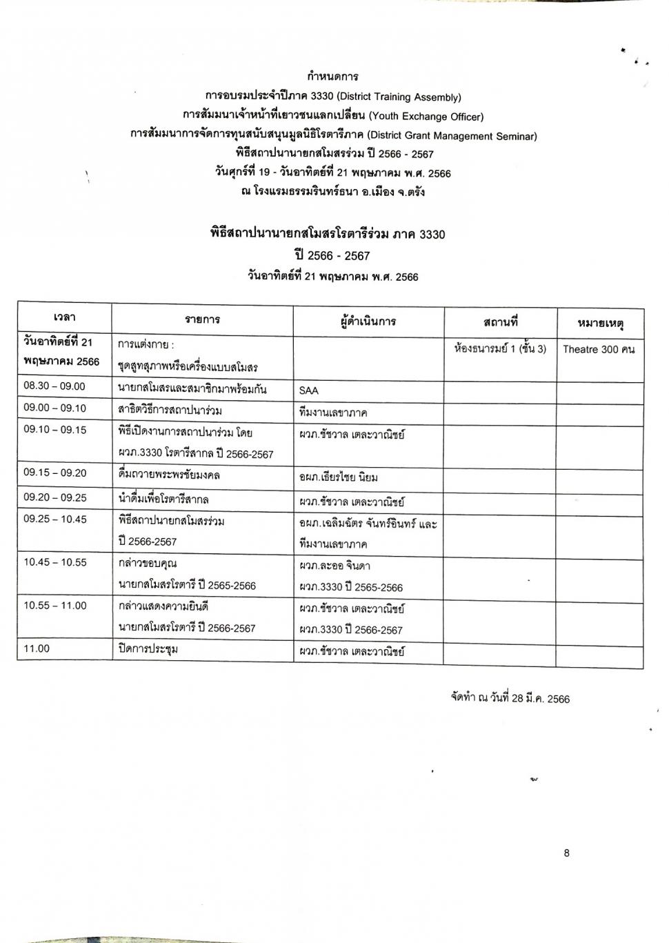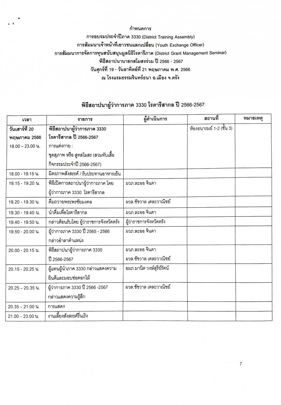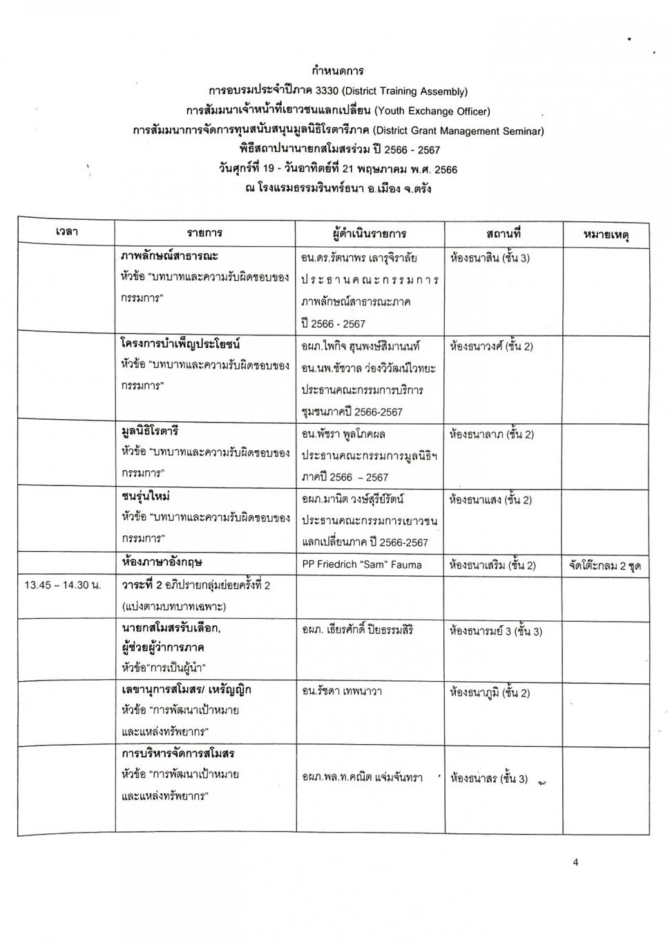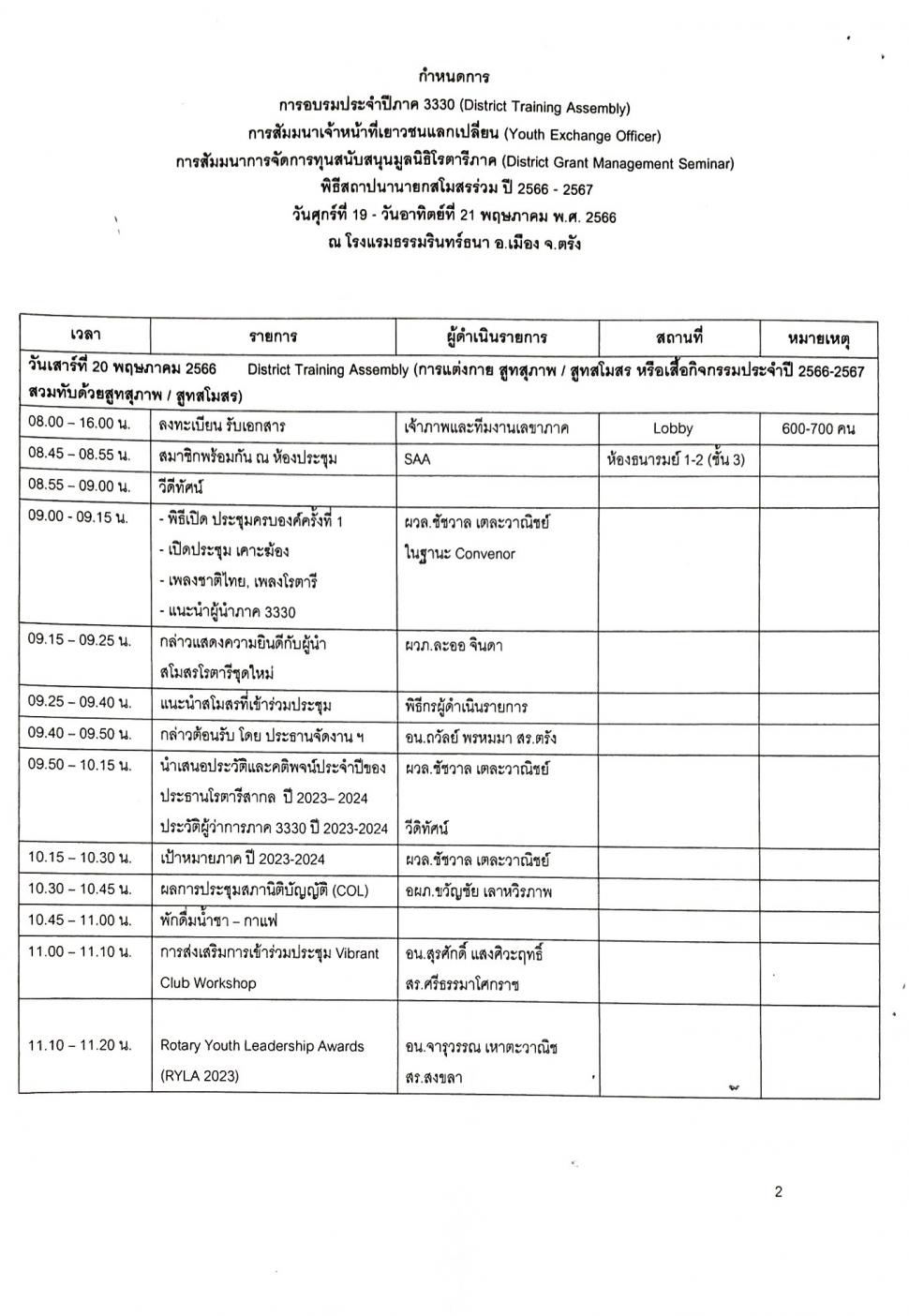 -การประชุม DISTRICT TRAINING ASSEMBLY (DTA)การอบรมภาค 3330 ประจำปี 2566-2567 วันที่ 19-21 พฤษภาคม2566 ณ โรงแรมธรรมรินทร์ธนา จ.ตรัง ได้ลงทะเบียนเข้าประชุมทั้งหมด 11 ท่าน